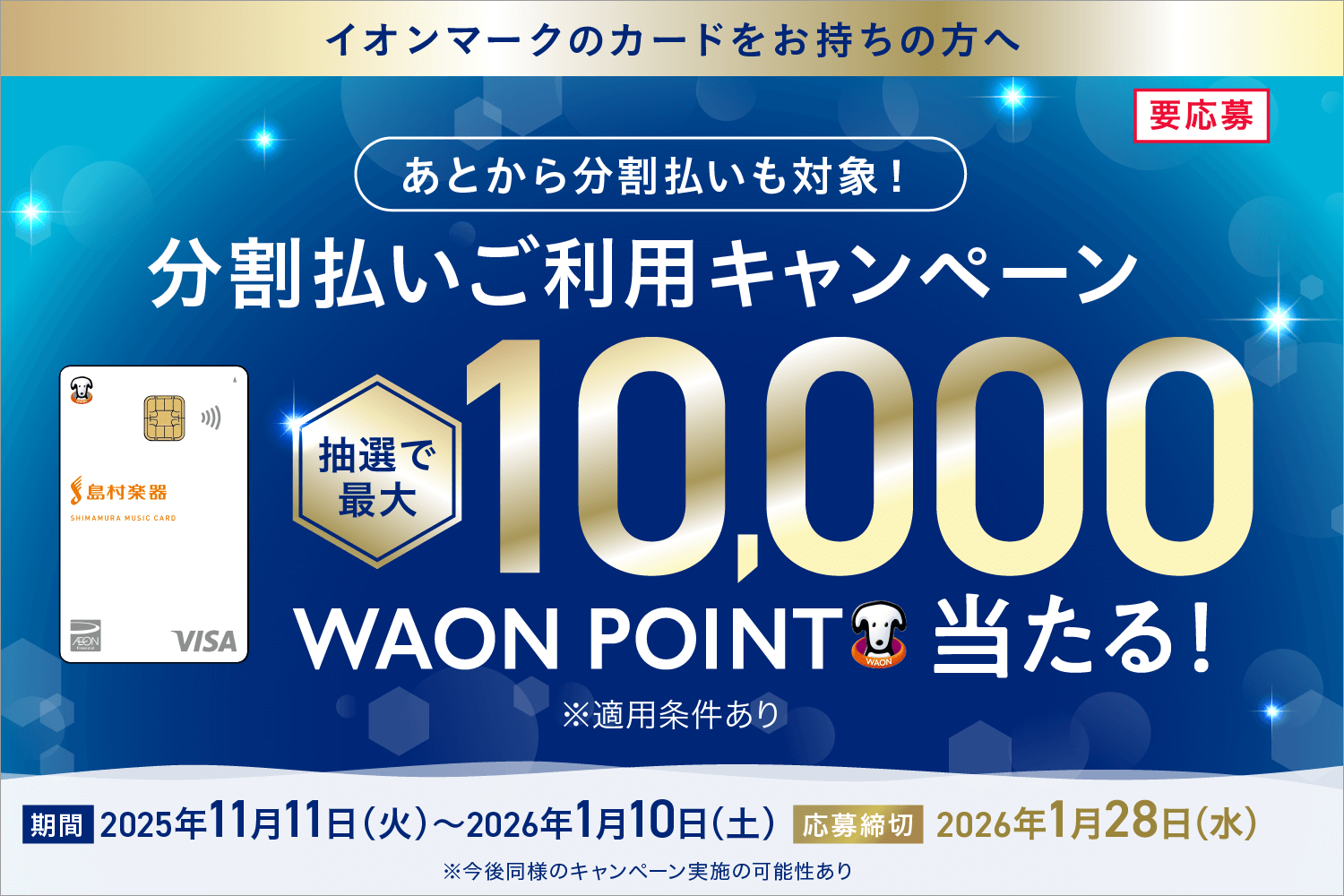 イオンフィナンシャルサービス(株)様が運営するイオンカード 暮らしのマネーサイトの、「シマムラミュージックカードオンライン申込」よりお申し込みいただけます。