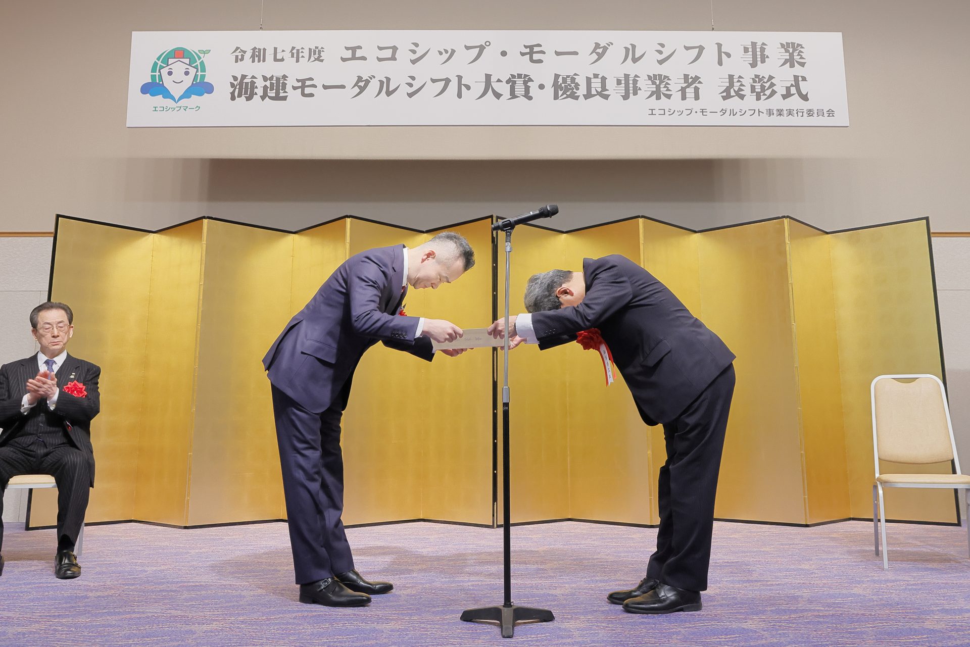 一般貨物の輸送において、荷主企業と物流事業者が一体となって海上輸送へのモーダルシフトを積極的に推進することで、省エネ・CO₂削減に貢献した事業者に対し、エコシップマークの使用を認める制度です。認定事業者の中でも特にモーダルシフトへの貢献度が高いと認められた事業者が「優良事業者」として選定され、国土交通省海事局長による表彰を受けます。