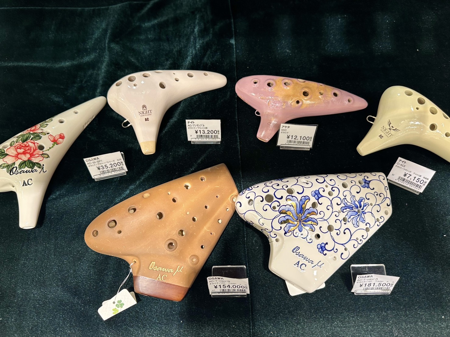 店頭商品で、素材が異なるオカリナと吹き比べもおすすめです。