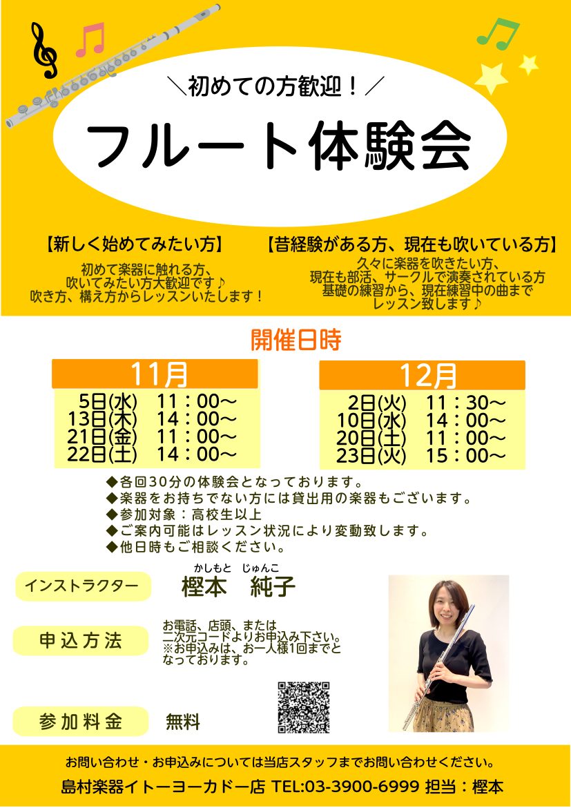 こんにちは!フルートインストラクターの樫本(かしもと)です。