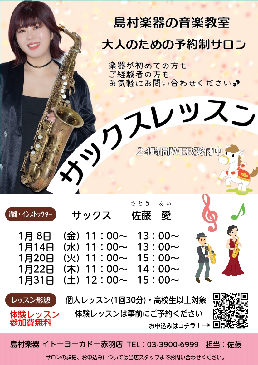 ![CONTENTSインストラクター紹介体験レッスンのご案内サックス・ソルフェージュ各種サロンのシステムインストラクター動画サックス会員様リモート演奏動画サックス会員様インタビュー♪インストラクター紹介 プロフィール埼玉県出身。洗足学園音楽大学卒業。クラシックサックスを石田裕美、冨岡和男、池上政人に師事 […]](https://www.shimamura.co.jp/shop/akabane/wp-content/uploads/sites/20/2025/03/20250306-550953104523133442.jpg)