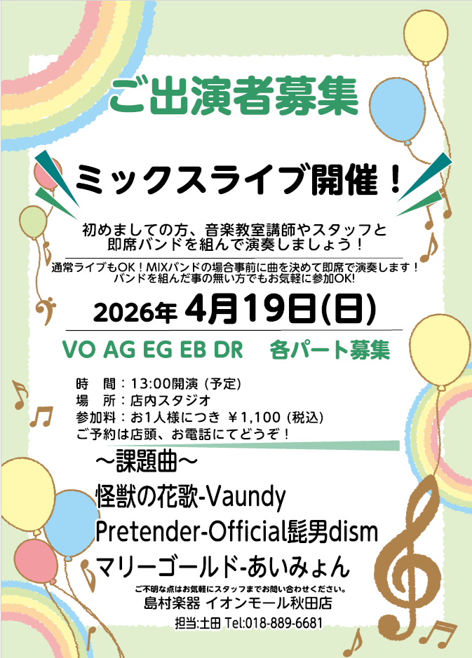 イオンモール秋田店で曲指定、パート募集型のライブイベント、ミックスライブを開催いたします!