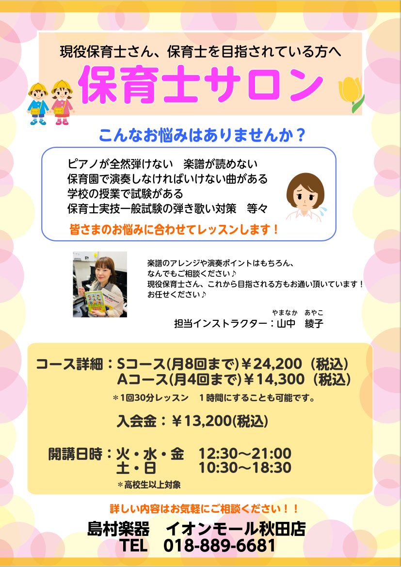 ![CONTENTS保育士さん・幼稚園の先生を目指されている方2027年度保育士一般実技試験対策 現役保育士さん、保育科の学校へ通う予定、または学生の方保育士さん・幼稚園の先生を目指されている方 2027年度保育士一般実技試験対策 一般で保育士受験をされる方 弾き歌いの課題曲2曲をレベルに合わせて選曲や […]](https://www.shimamura.co.jp/shop/akita/wp-content/uploads/sites/18/2025/01/20250205-2e92559d17f38bc56eca2f72998f9695.png)