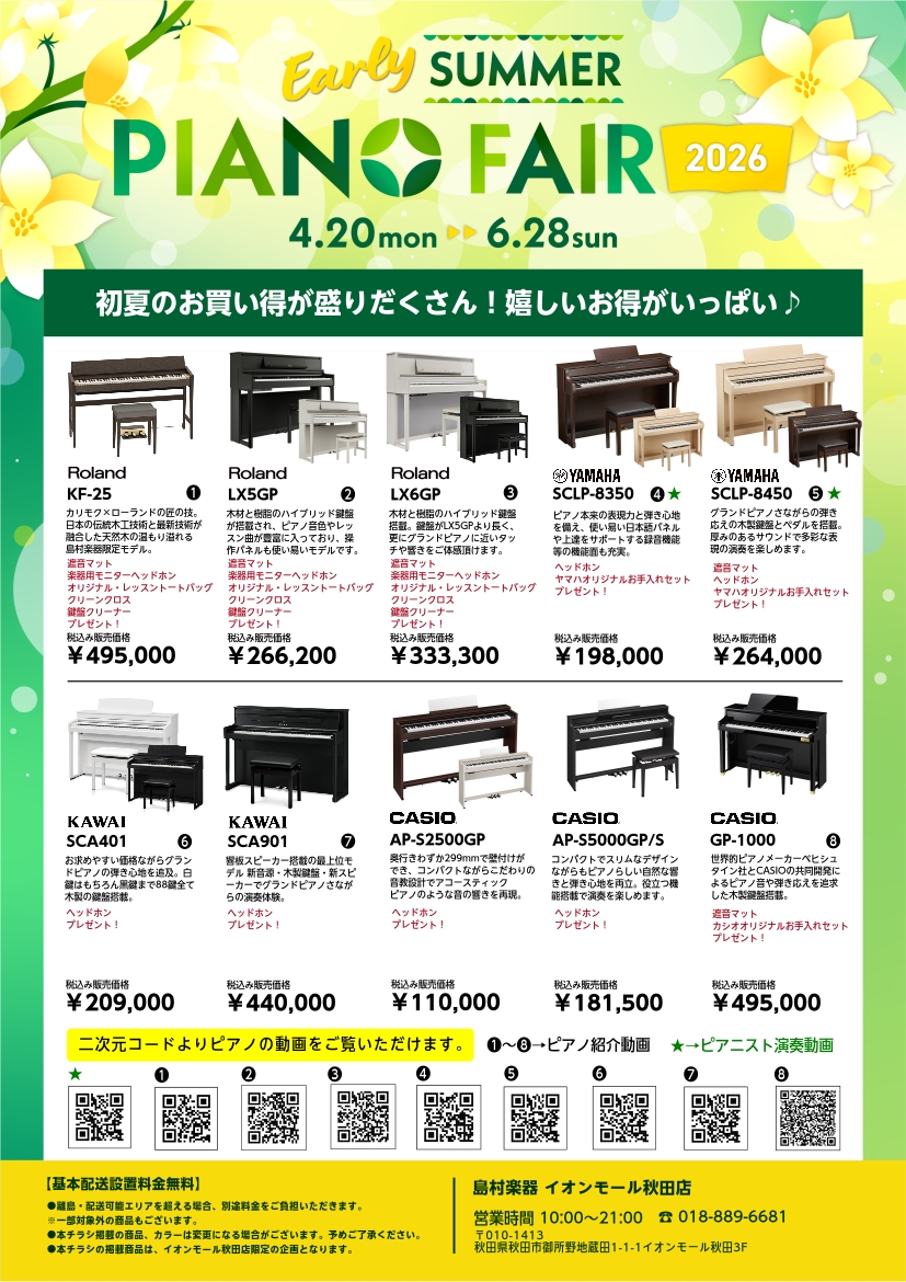 人気メーカーのピアノを一度にご覧頂けます!秋田県(秋田県周辺)で電子ピアノをお探しでしたら島村楽器イオンモール秋田店にお任せください!!