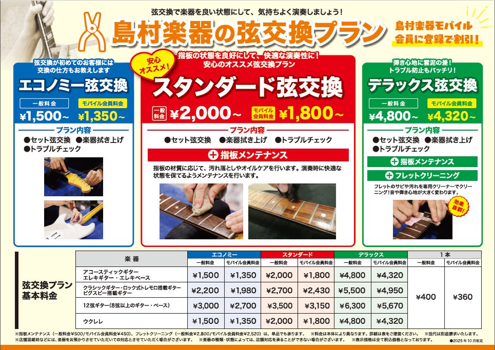 弦交換の方法も丁寧にレクチャー致します! 弦交換のやり方がわからない!という方にも丁寧にレクチャーしております。いつもの弦交換に併せてコンディションチェックもお任せください。デラックスコースではフレットクリーニングで汚れや経年によるサビを落としも行っています。フレットがピカピカになる事で、押弦時に生 […]