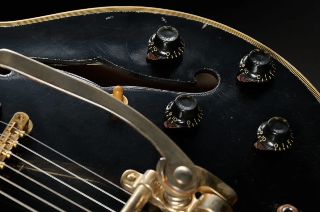 Keith Richards氏、ご本人の1960 ES-355を3Dスキャンし造形されております。更にマーフイー・ラボの技術が加わり、最高の一本に仕上がっております。ボディの色味、アーチトップの付近の光りの反射具合、更に、二つのCustombucker pickups、ビグスビーアーム(Bigsby B7 Vibrato)、ペグ等ハードウェアにおけるエイジド加工がなされたゴールドパーツ…全てが"渋くて、最高にカッコイイ"です。