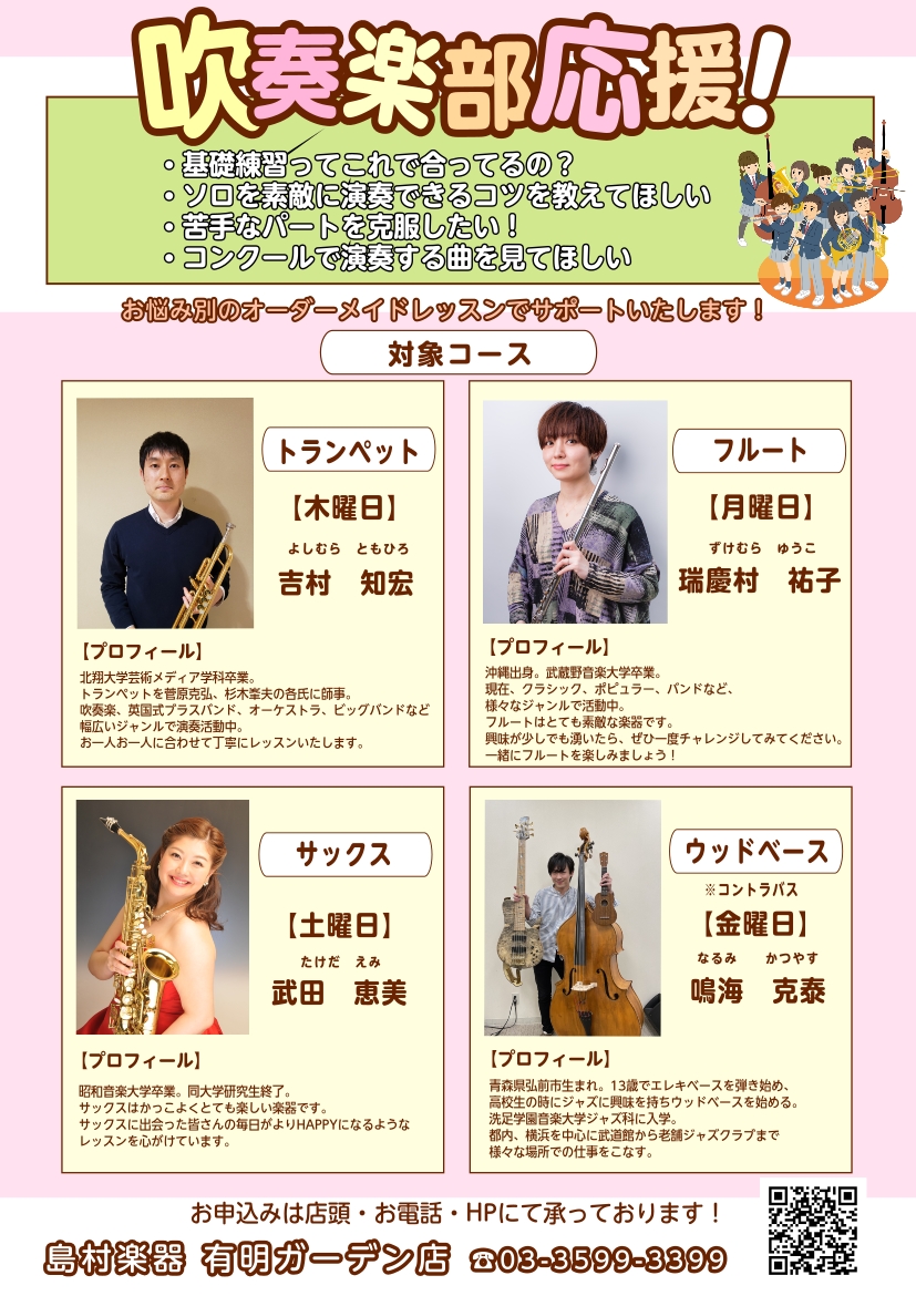 学校のパート練習ではなかなか聞けない細かい奏法や、あなたに合わせた練習メニューをプロの講師がアドバイスします。 部活の譜面を持ち込みOK!