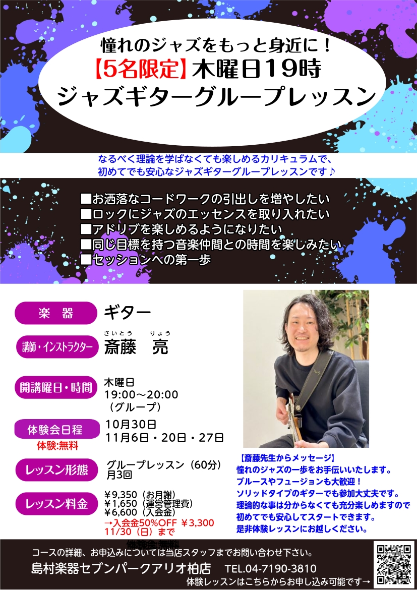 ![【5名限定】木曜19:00スタート「ジャズギターグループレッスン」体験会受付中! 🟣 理論がわからなくても大丈夫!🟣 お洒落なコードワークやアドリブを楽しめるように🎵🟣 同じ目標を持つ仲間と一緒にセッション体験! ブルース、フュージョンも大歓迎!ジャズギターの世界を一歩踏み出してみませんか? 📅 体 […]](https://www.shimamura.co.jp/shop/ario-kashiwa/wp-content/uploads/sites/174/2025/10/20251019-20251019-63f7efeb26e40acc08e57c5246dd4bc4-480x320-1.jpg)