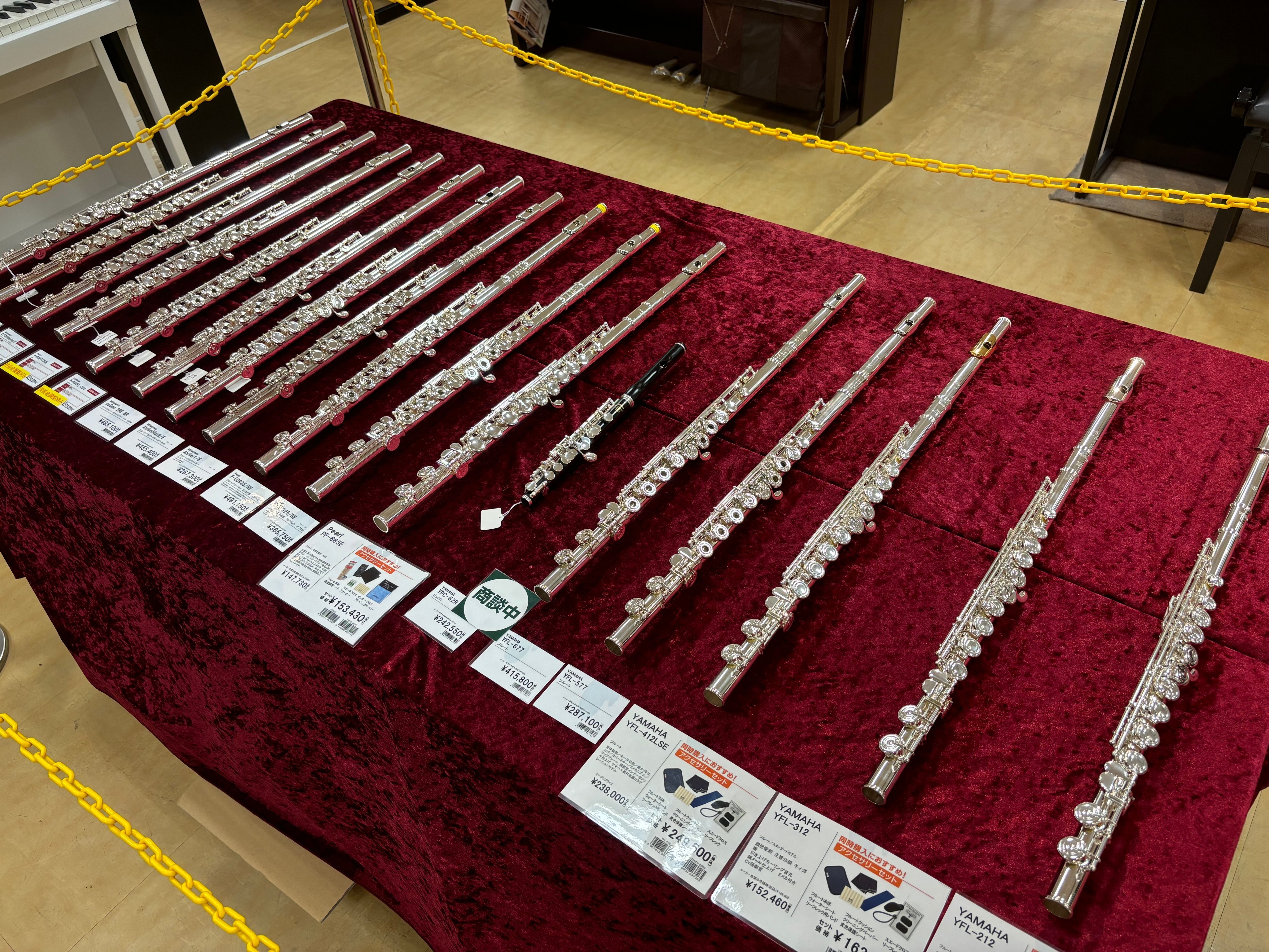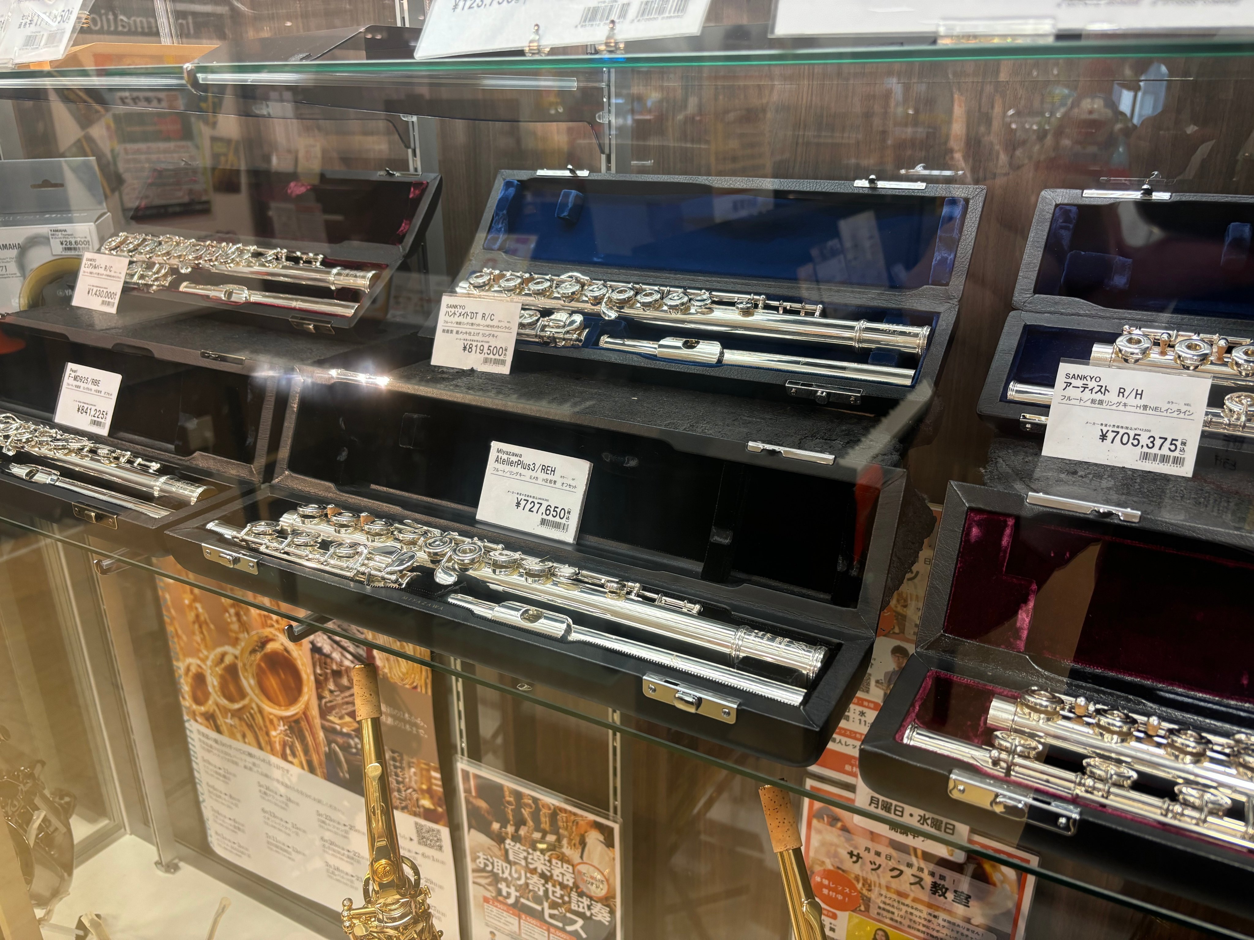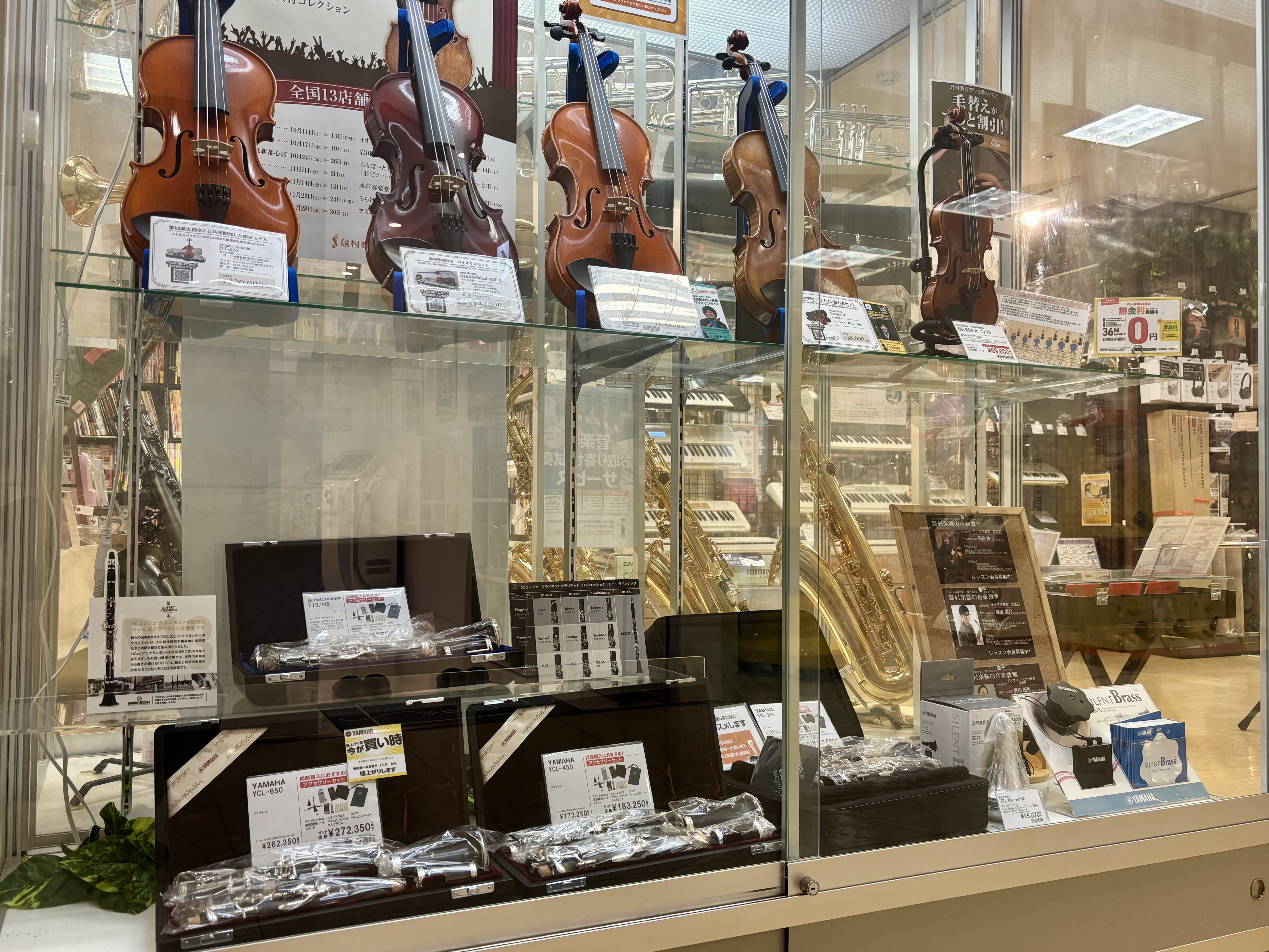 当店では、フルートやクラリネット、サックス、トランペットなど多彩な管楽器を取り揃えております。実際に手に取ってご覧いただいたり、ご試奏いただくことも可能です。ただし、タイミングによっては店頭に在庫がない場合もございますので、予めご了承ください。お取り寄せのご相談やご試奏の手配も承っておりますので、お気軽にスタッフまでお声がけください。