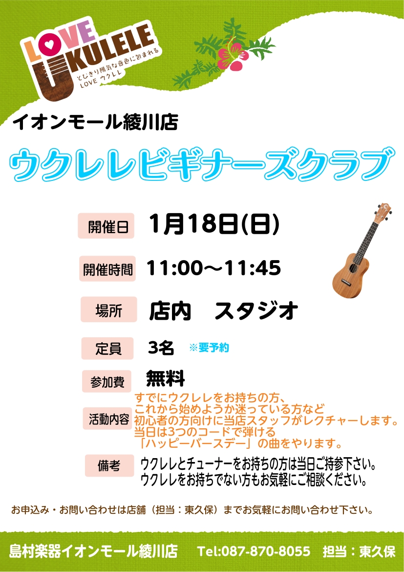 | ウクレレ | 1月18日(日) 11時~11時45分 |