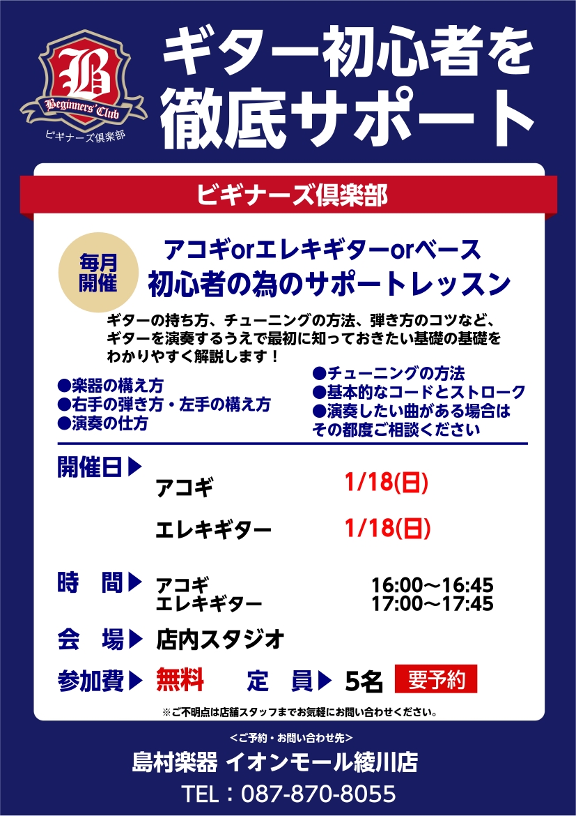 ![CONTENTS『ビギナーズ倶楽部』とは1月の開催日時ご予約方法「ギターセンパイ」のご紹介お問い合わせ『ビギナーズ倶楽部』とは 楽器初心者のみなさんが感じている悩みや疑問を、店舗にて島村楽器スタッフがわかりやすくレクチャー、サポートいたします!ちょっとした不安がある方はぜひ参加してみてください。 1 […]](https://www.shimamura.co.jp/shop/ayagawa/wp-content/uploads/sites/123/2023/07/20260109-cc3a82956f1fdd55e15a466bb7291a75.jpg)