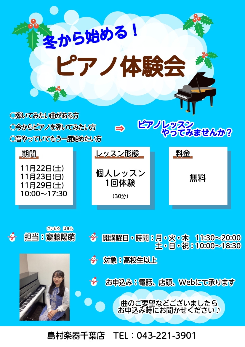 ![こんにちは!ピアノインストラクターの齋藤です!こちらではピアノ体験会をご案内いたします。 ピアノを始めてみたい方、自分に出来るか不安な方、皆さんお気軽にご参加ください。 CONTENTS体験会詳細ピアノサロンのご案内インストラクター紹介レッスン案内お問合せ体験会詳細 ※他の曜日・時間をご希望の場合も […]](https://www.shimamura.co.jp/shop/chiba/wp-content/uploads/sites/30/2025/09/20251028-shima251028-0081midasi.jpg)