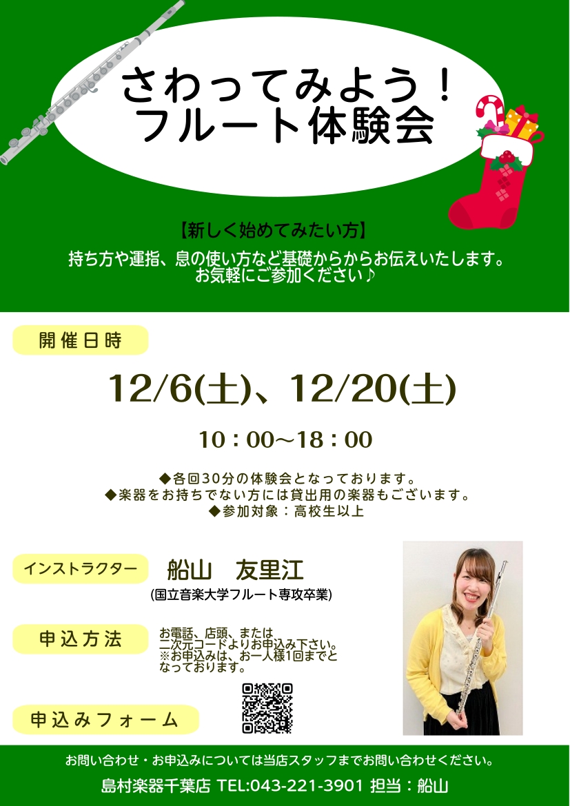 ![CONTENTS初めての方もお気軽にご参加いただけるフルート体験会です!体験会詳細フルート教室のご案内インストラクター紹介レッスン案内初めての方もお気軽にご参加いただけるフルート体験会です! こんにちは!フルートインストラクターの船山です!こちらでは12月の体験会をご案内いたします。 フルートが全く […]](https://www.shimamura.co.jp/shop/chiba/wp-content/uploads/sites/30/2025/10/20251119-94ed25070fd21c005677ea612ea4b563.jpg)