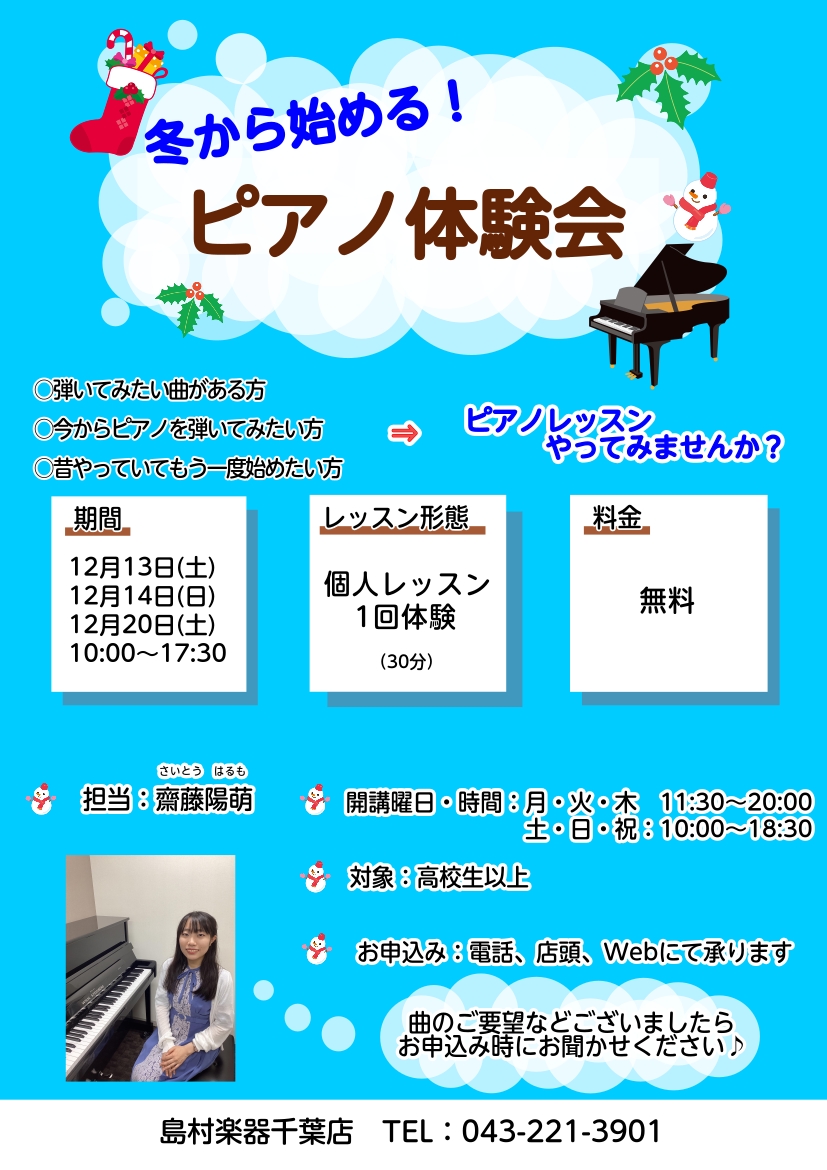 ![こんにちは!ピアノインストラクターの齋藤です!こちらではピアノ体験会をご案内いたします。 ピアノを始めてみたい方、自分に出来るか不安な方、皆さんお気軽にご参加ください。 CONTENTS体験会詳細ピアノサロンのご案内インストラクター紹介レッスン案内お問合せ体験会詳細 ※他の曜日・時間をご希望の場合も […]](https://www.shimamura.co.jp/shop/chiba/wp-content/uploads/sites/30/2025/09/20251028-shima251028-0081midasi.jpg)