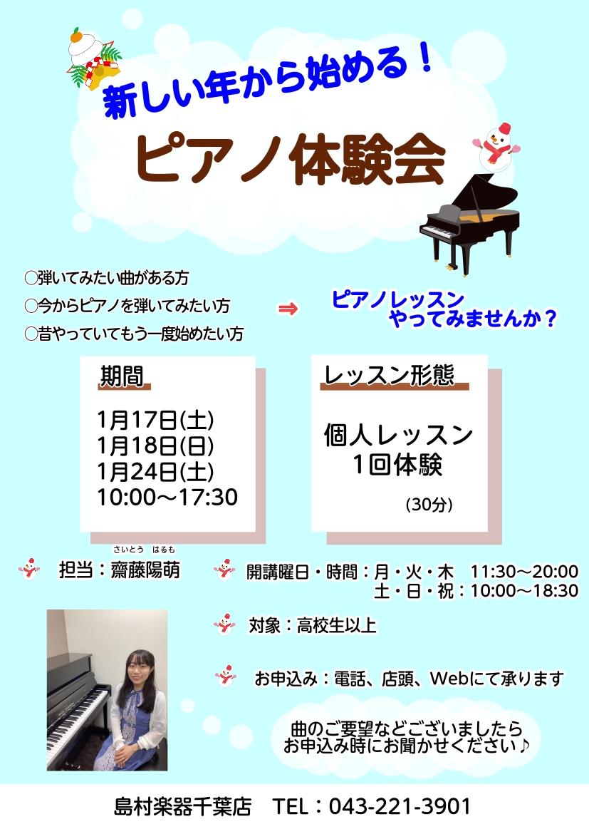 ![こんにちは!ピアノインストラクターの齋藤です!こちらではピアノ体験会をご案内いたします。 ピアノを始めてみたい方、自分に出来るか不安な方、皆さんお気軽にご参加ください。 CONTENTS体験会詳細ピアノサロンのご案内インストラクター紹介レッスン案内お問合せ体験会詳細 ※他の曜日・時間をご希望の場合も […]](https://www.shimamura.co.jp/shop/chiba/wp-content/uploads/sites/30/2026/01/20260105-shima260105-0159bana-.jpg)