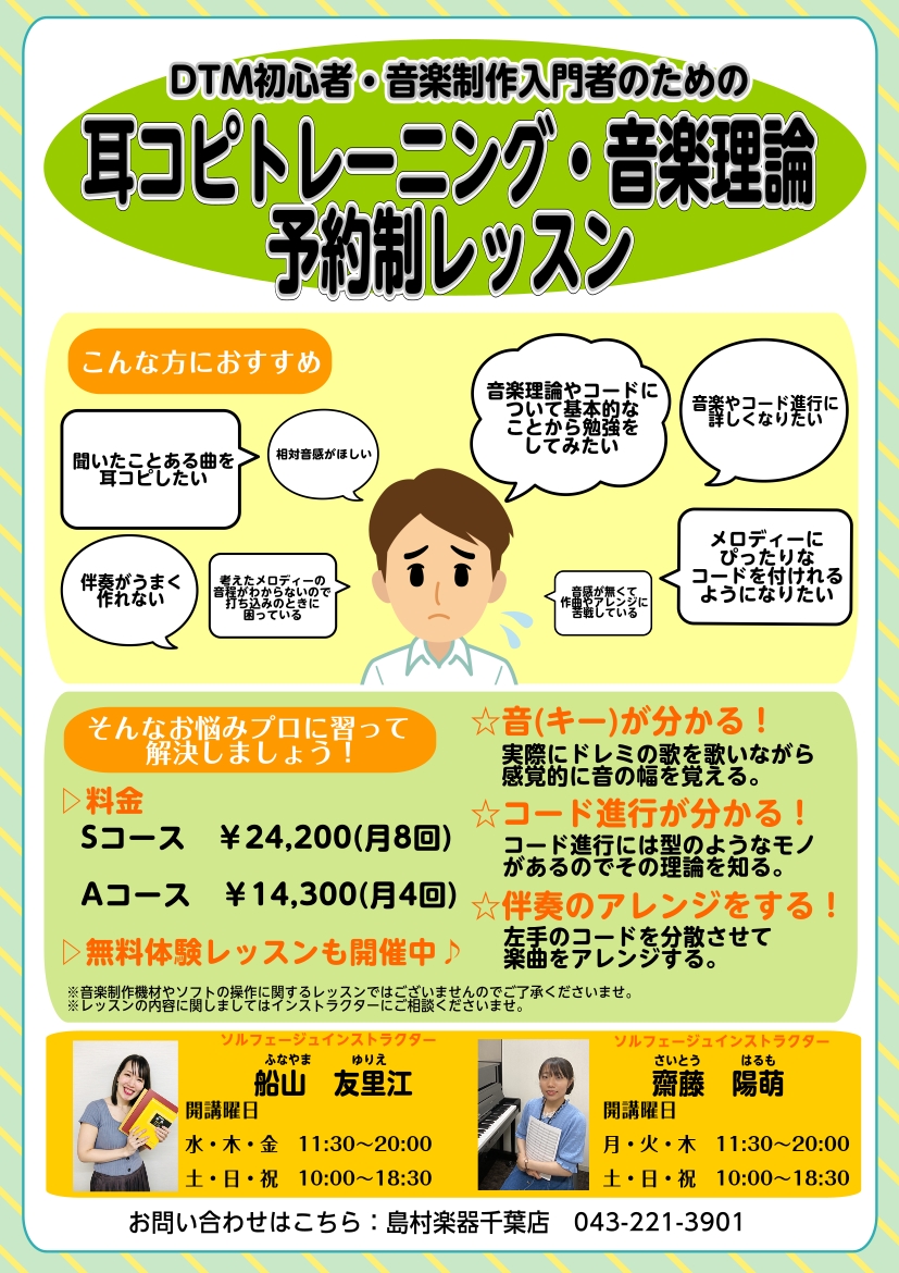 ![皆様こんにちは。島村楽器 千葉店 ソルフェージュ インストラクターの齋藤です! ソルフェージュレッスンでは、DTM・音楽制作をしている方へ耳コピトレーニングや音楽理論のレッスンをしています。 レッスンをご受講いただくと・音(Key)がわかるようになる・メロディーに合ったコードを付けられるようになる・ […]](https://www.shimamura.co.jp/shop/chiba/wp-content/uploads/sites/30/2026/02/20260216-a11b4bb3ba448d1fa402ac3dc62cc91f-1.jpg)