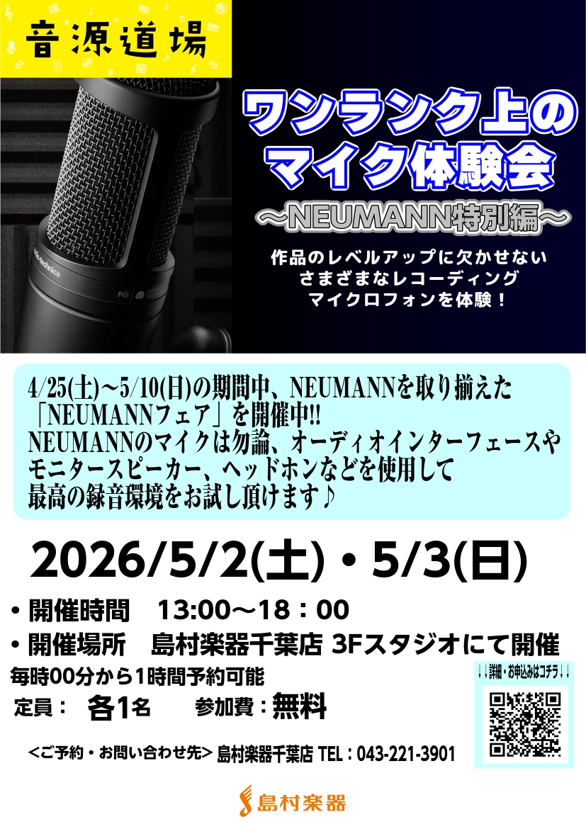 ![あなたの音源にプロの視点を! 「音源センセイ」はオリジナルもコピーカバー楽曲も全作品にアドバイスがもらえる、島村楽器の音楽制作サポートプログラムです。 音楽制作をしていると、壁にぶち当たることが多々あると思います。「何か的確なアドバイスや改善点を貰えたらいいのになぁ・・・。」と思う時があります。そん […]](https://www.shimamura.co.jp/shop/chiba/wp-content/uploads/sites/30/2026/04/20260423-ongen_chiba.png)