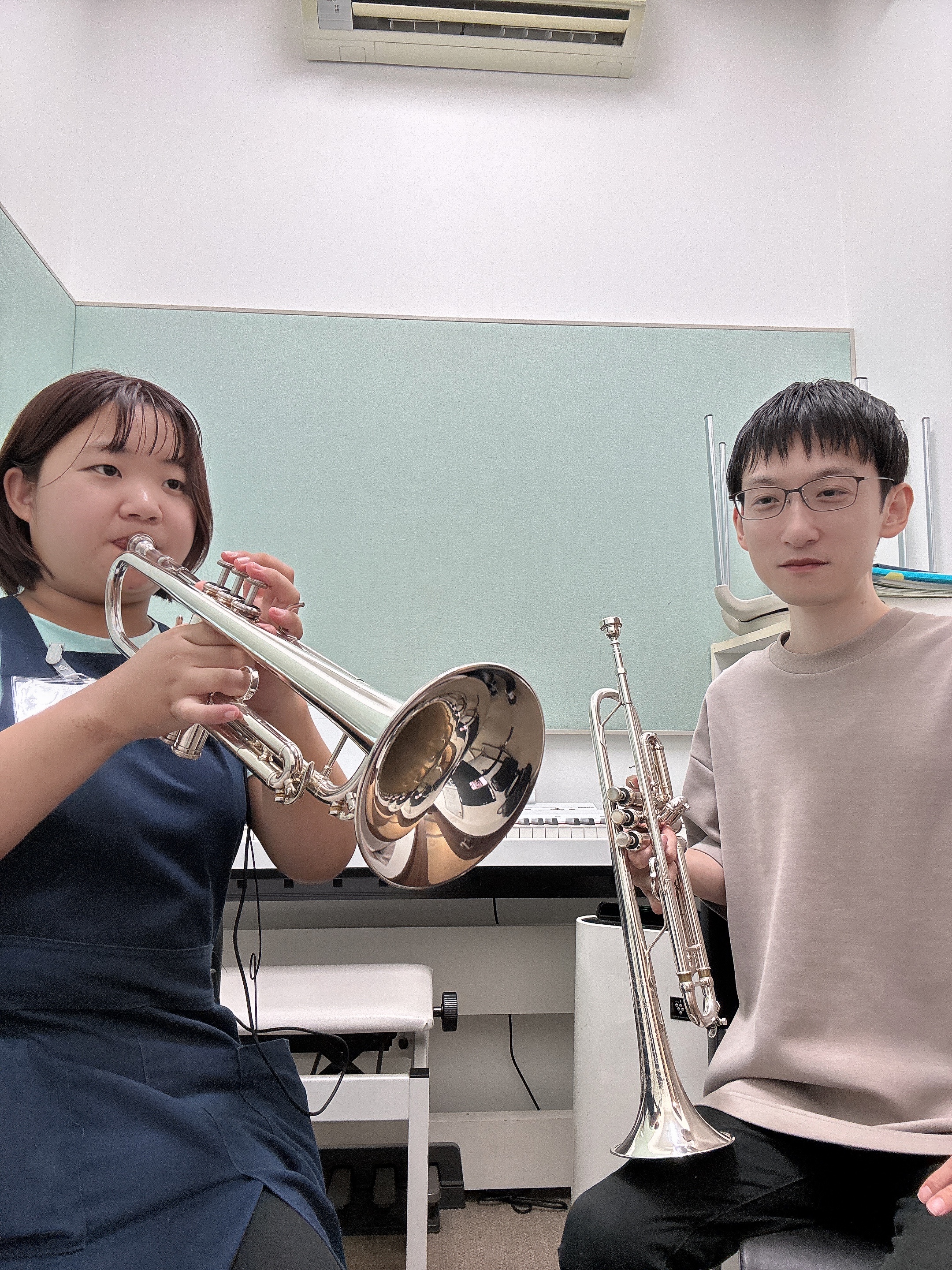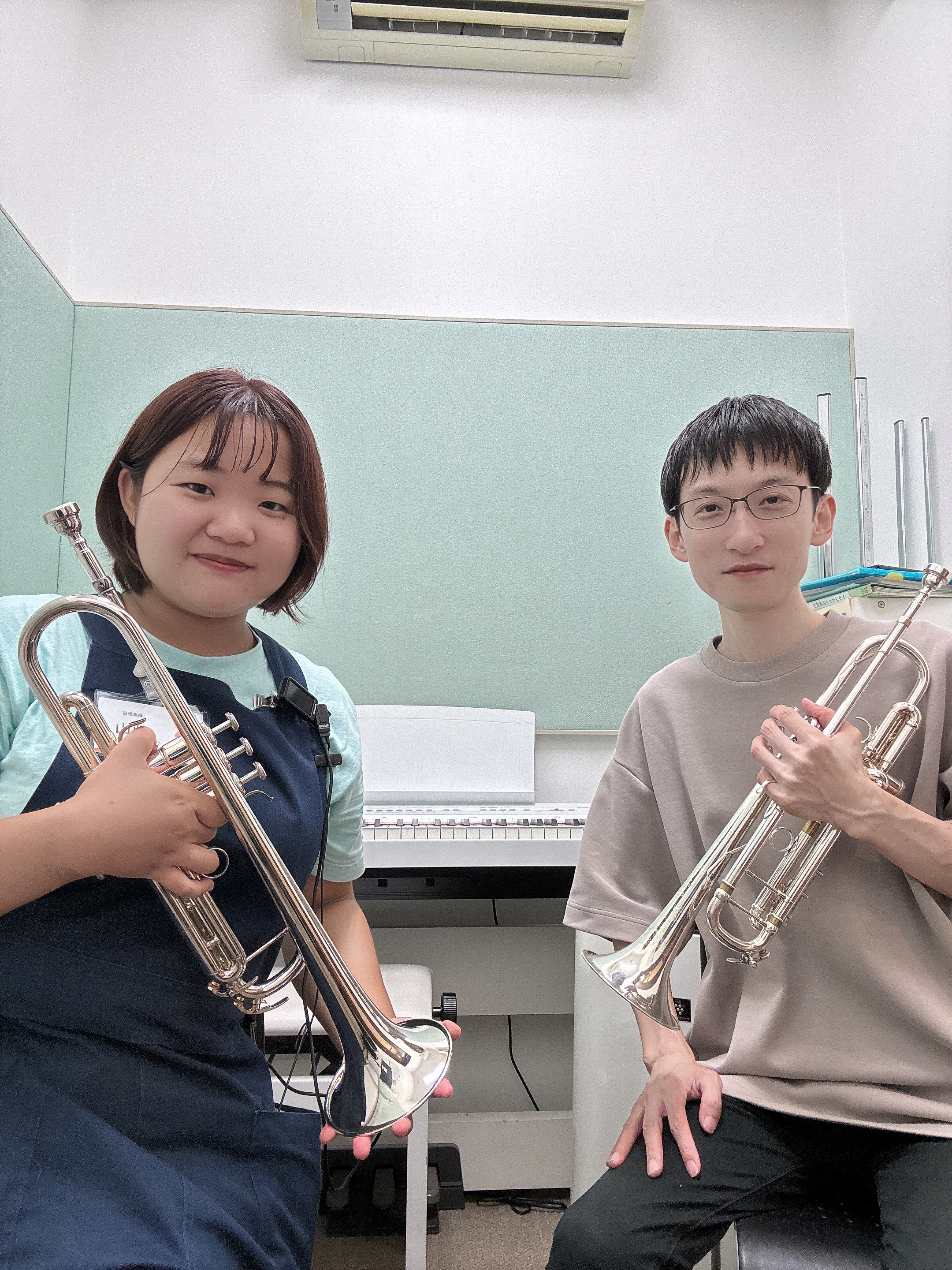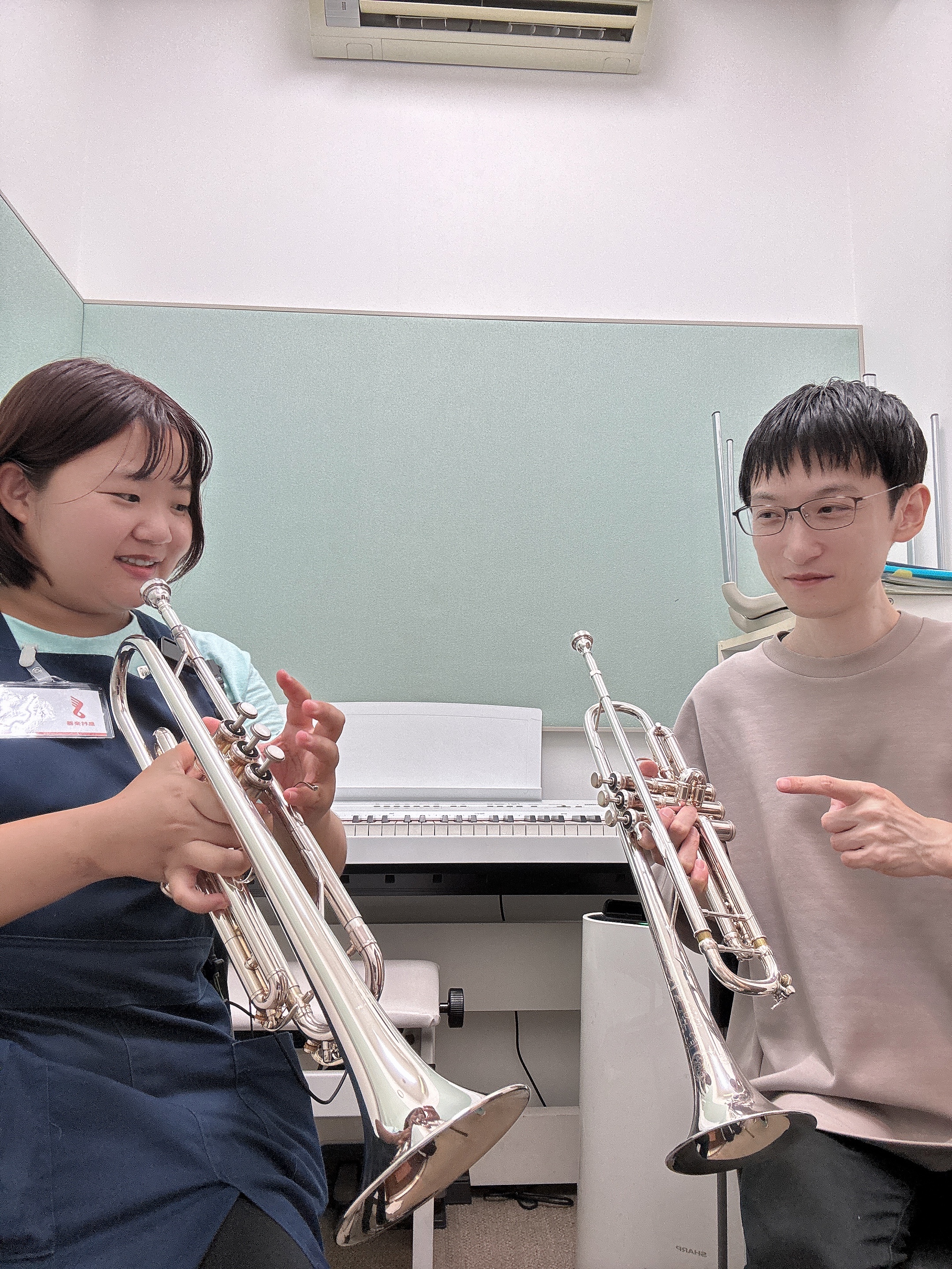 今回、レッスンしてくださったのは、トランペット講師の山本 晃稔先生。そして、実際に体験したのは当店スタッフの秋山です!