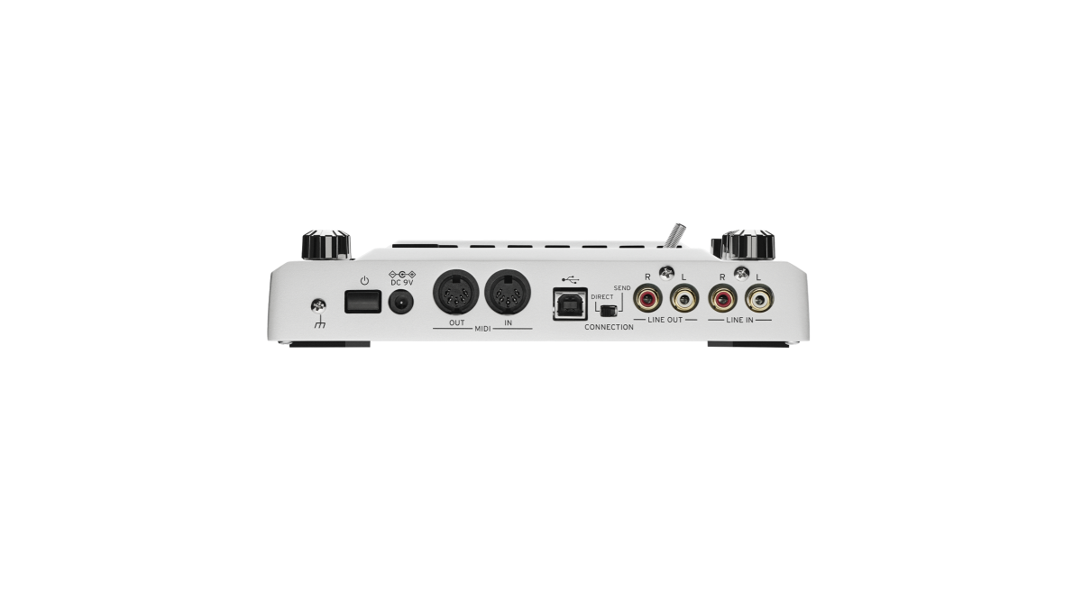 ・端子:OUTPUT/LINE IN(L/R RCA)、MIC/ギター兼用端子、ヘッドホン、MIDI IN/OUT、USB-B