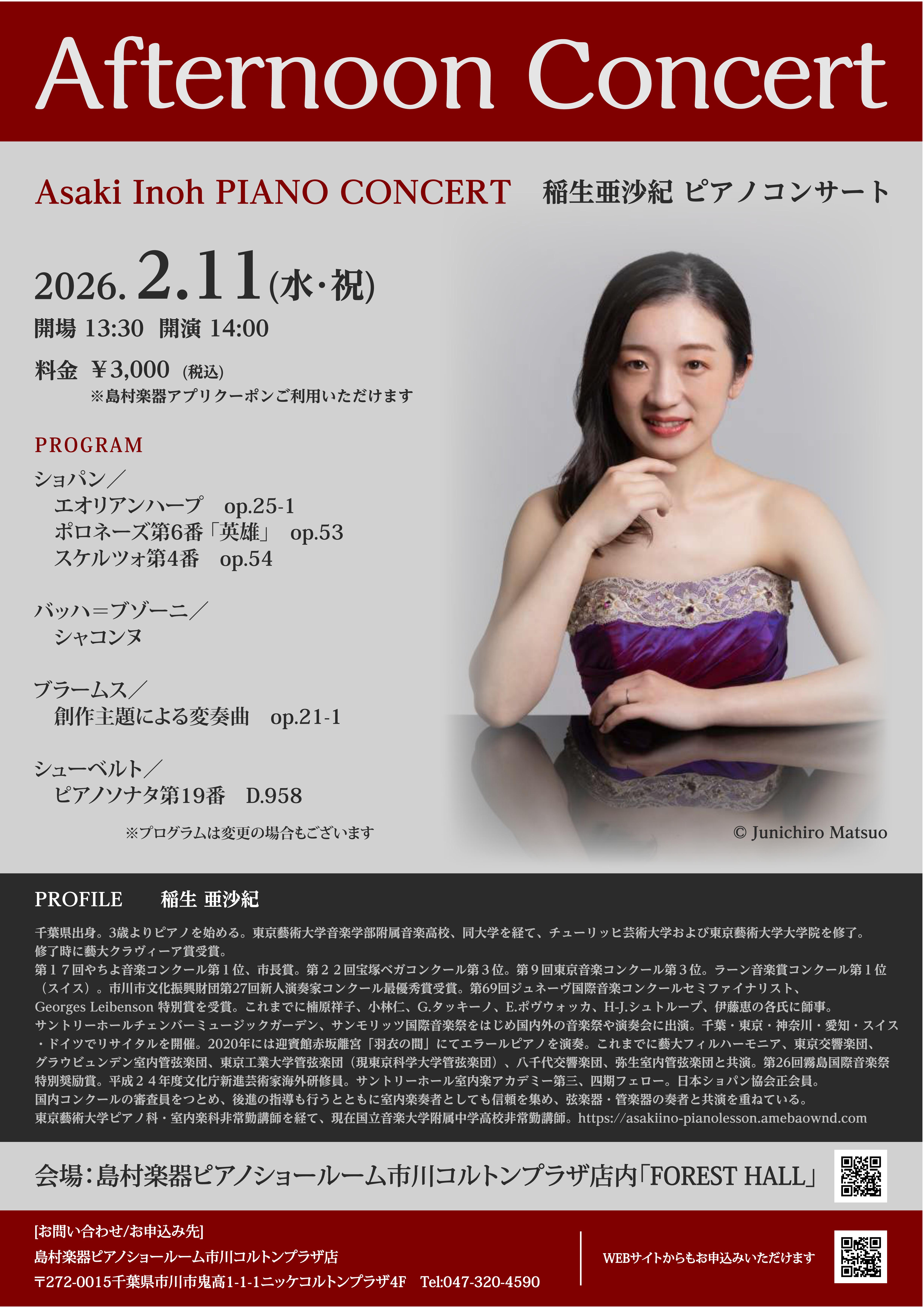 アフタヌーンコンサート 稲生亜沙紀 ピアノコンサート