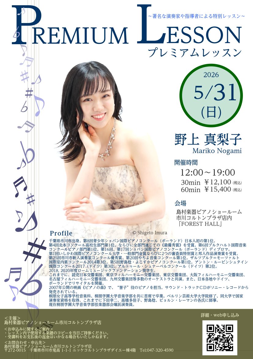 毎回ご好評をいただいております、プロのピアニストによる本格的なレッスンのご案内です。 ピアニスト・野上真梨子さんのプレミアムレッスン受講生を募集いたします。 ベルリン芸術大学にて研鑽を積まれた野上さんに、丁寧に練習のコツ・奏法をご指導していただけます。今回は、高校生までのお子様を対象に受講生を募集し […]