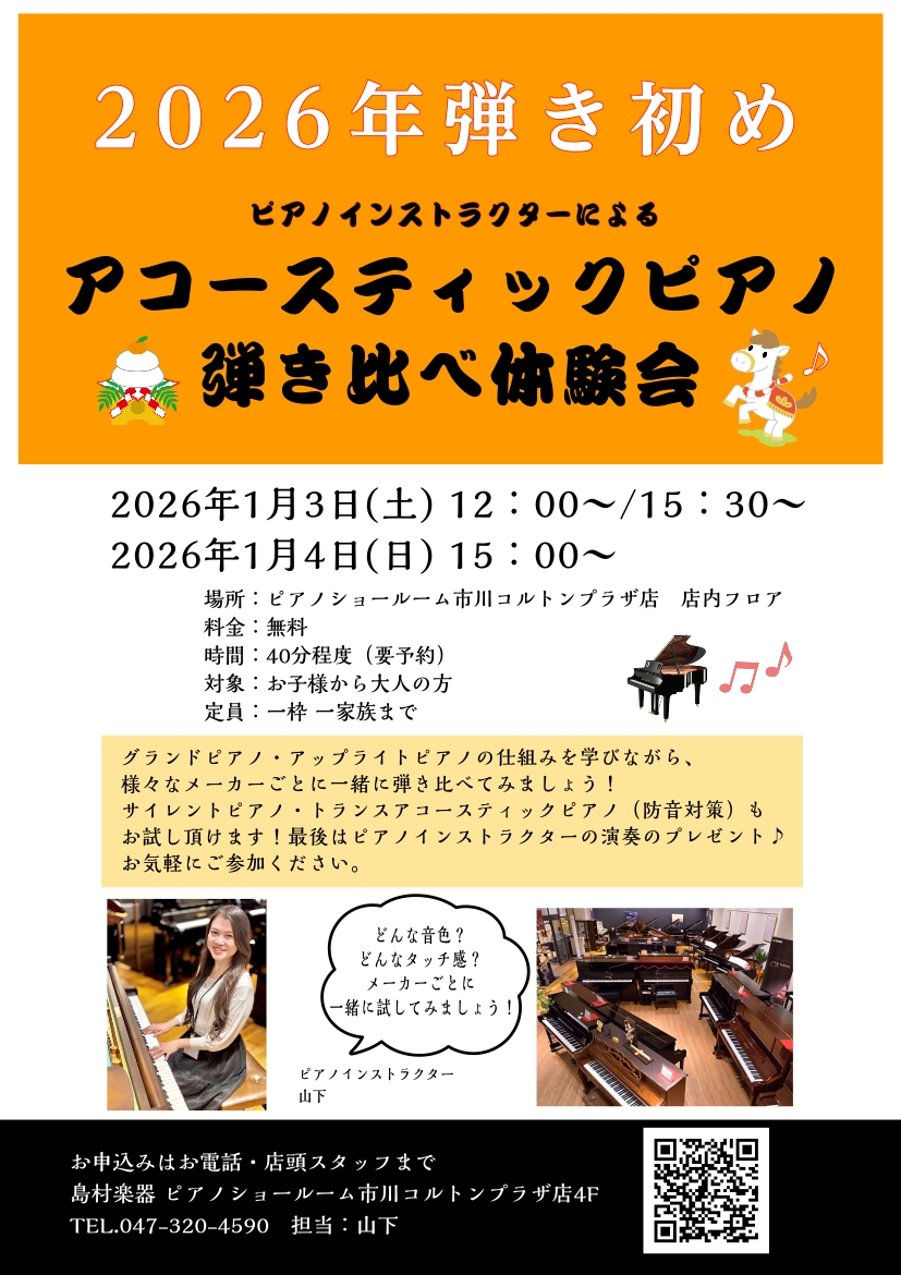 | お申込み・お問い合わせ | 島村楽器ピアノショールーム市川コルトンプラザ店 TEL 047-320-4590 担当 山下 |