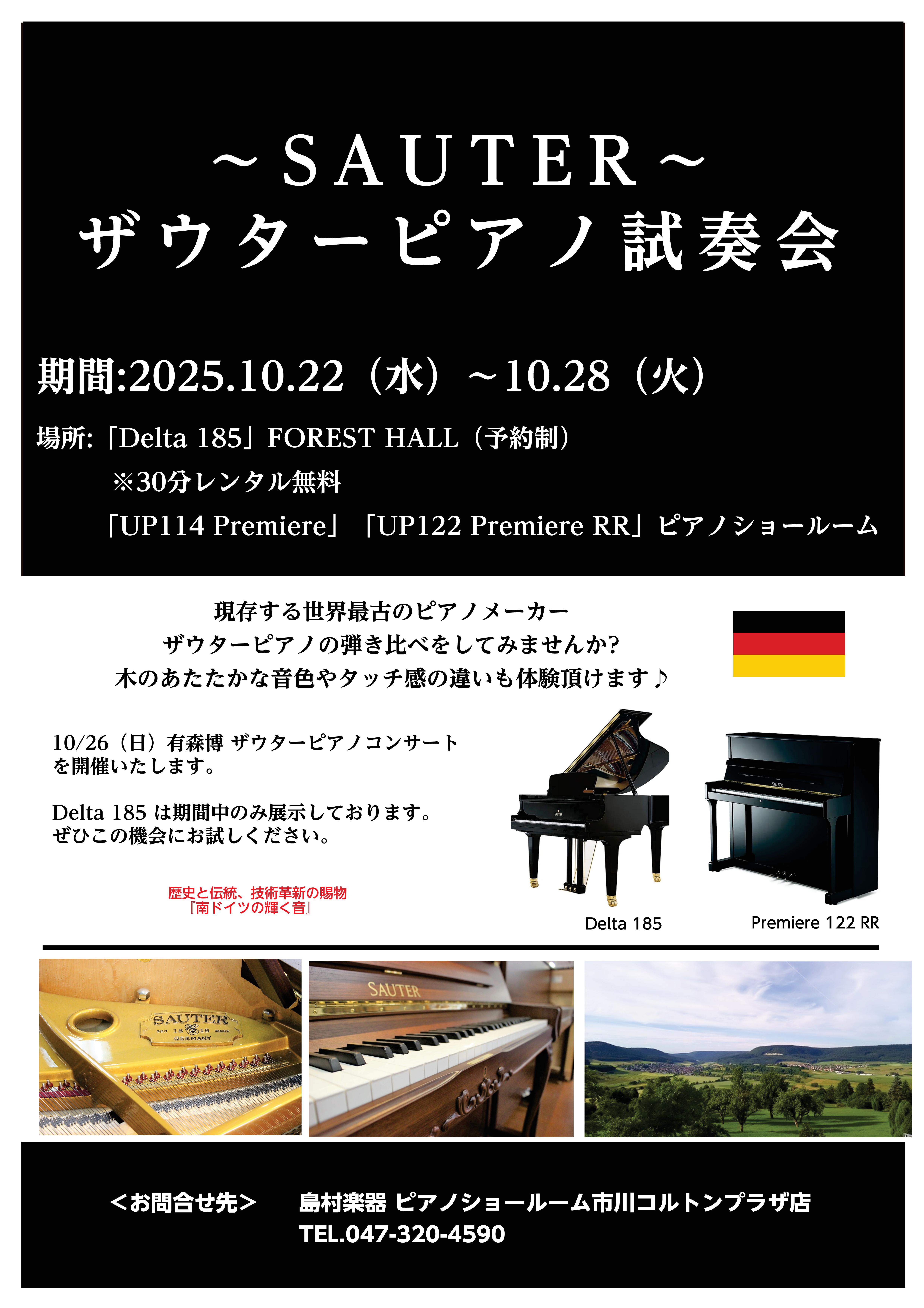 ![当店「FOREST HALL」内に、期間限定にてザウター「Delta185」を展示いたします!煌びやかかつ華やかな音色を、集中して演奏できる環境でぜひお楽しみください。(※Delta 185は試奏会期間限定での展示になります、この機会に是非ご体感ください!) CONTENTSDelta185のご紹介 […]](https://www.shimamura.co.jp/shop/colton-piano/wp-content/uploads/sites/134/2025/10/20251015-product_shima251012-0155-1_template_pdf-1.jpg)