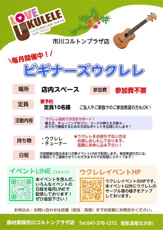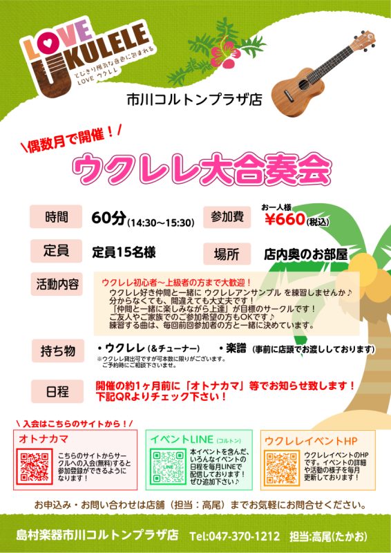 市川コルトンプラザ店では、初心者から参加できるウクレレイベントを定期開催しています!