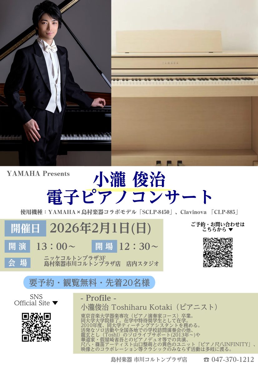 ピアニスト小瀧俊治氏をお迎えし、電子ピアノの魅力を存分に味わっていただけるコンサートを開催します。 CONTENTSコンサート詳細小瀧俊治氏 プロフィール小瀧俊治氏 演奏動画お問い合わせ、ご予約はこちらから市川コルトンプラザ店までのアクセスはこちら↓コンサート詳細 小瀧俊治氏 プロフィール 小瀧俊治 […]