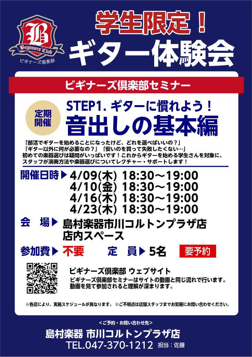 そんなドキドキと不安を抱えている皆さんのために、当店では未経験者大歓迎の「学生限定・ギタービギナーズ倶楽部ミニ」を開催します!