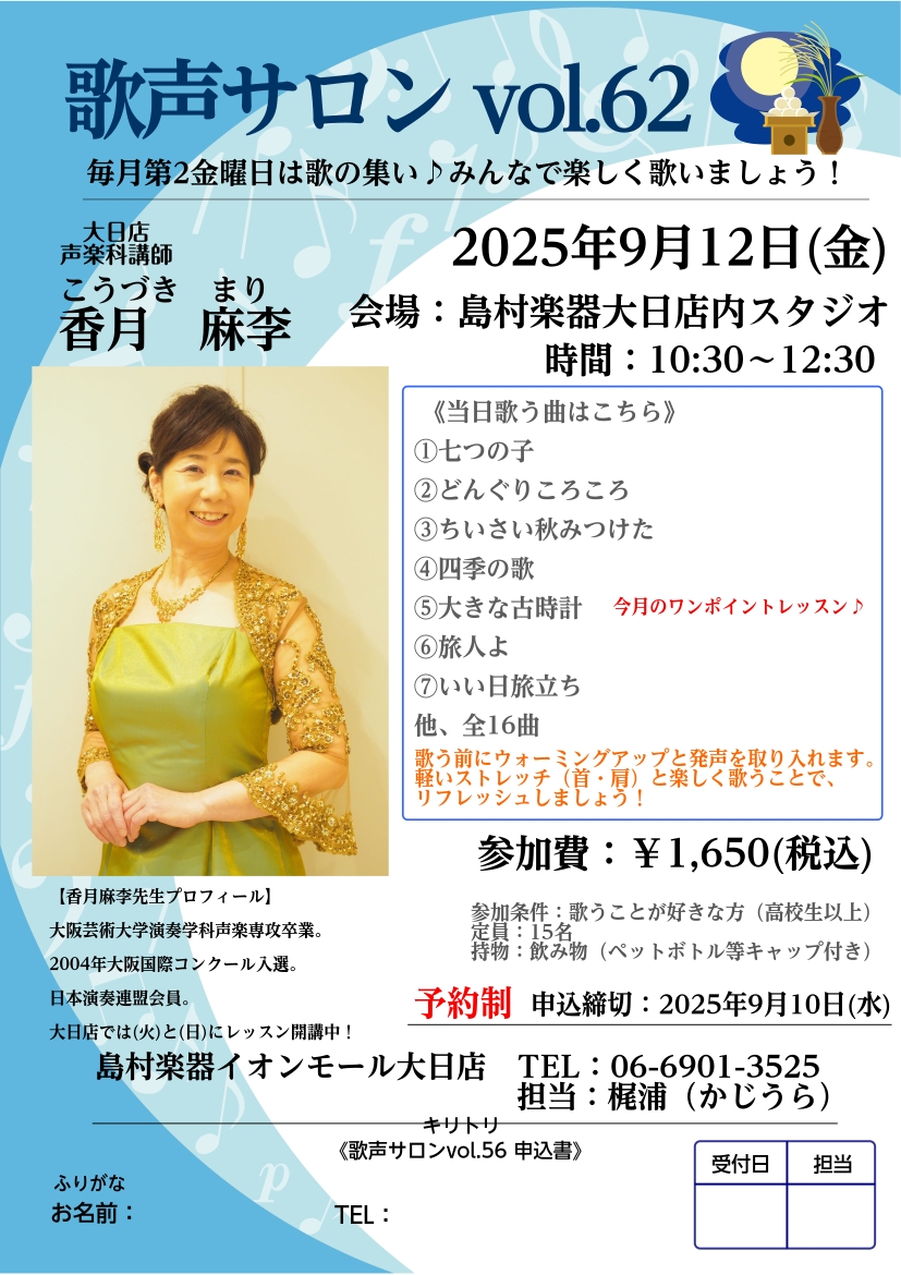 大日店音楽教室 声楽科講師 香月 麻李(こうづき まり)先生による「歌声サロン」のご案内です♪