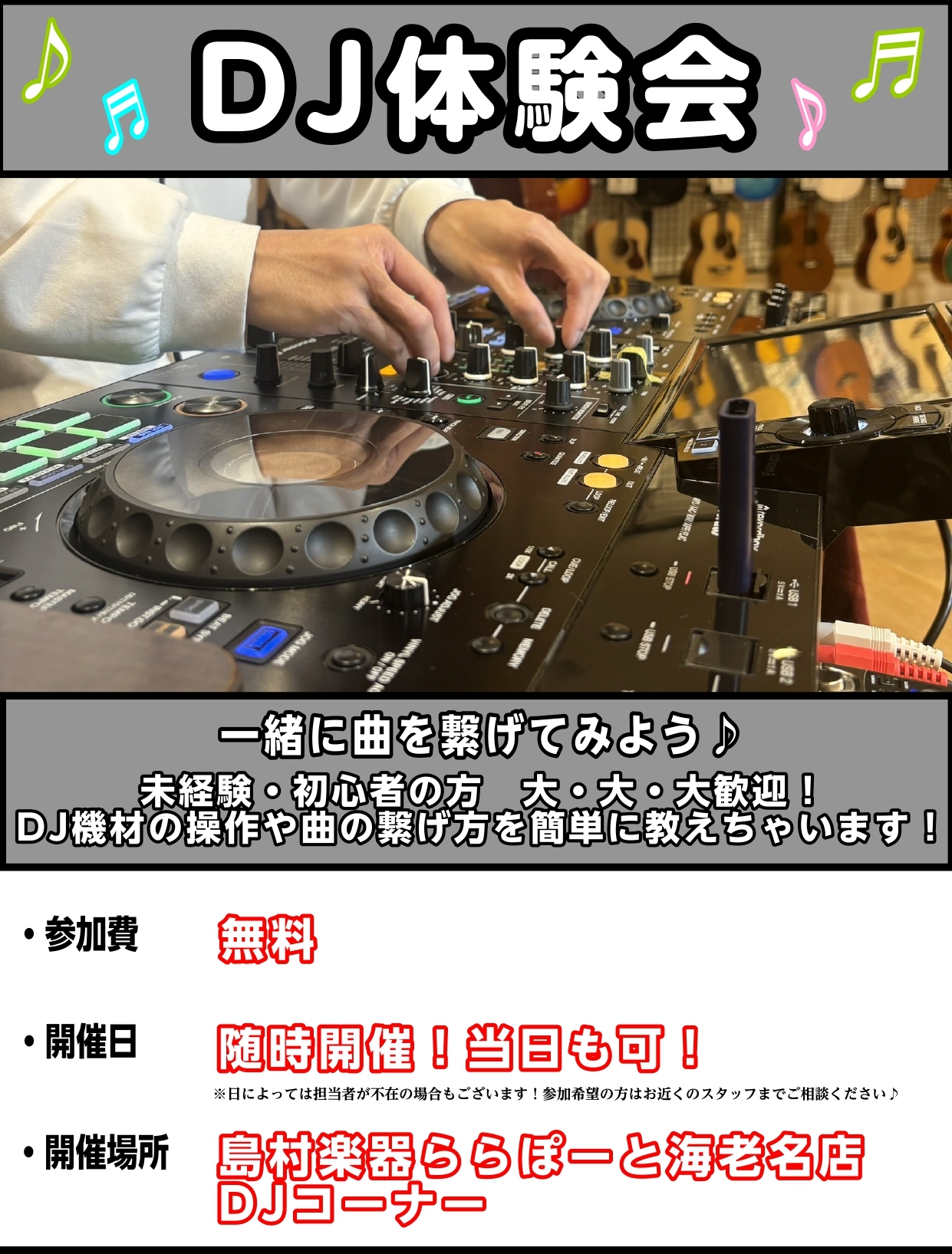 ![DJ体験会を店内DJコーナーにて随時開催! こんにちは!島村楽器ららぽーと海老名店 DJ担当の和田です!プチDJ体験ができるイベントを随時開催しています♪DJに興味があるけど何をしているかわからない...初心者でも大丈夫かな....もちろん大丈夫!一緒に曲を繋いでDJしてみましょう♪体験会以外にも、 […]](https://www.shimamura.co.jp/shop/ebina/wp-content/uploads/sites/170/2025/05/20250709-product_shima250709-0064-1_template_pdf_page-0001-2.jpg)