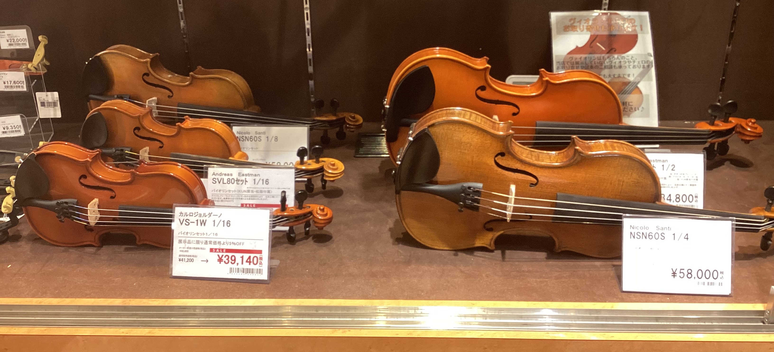 現在、当店では1/2,1/4,1/8,1/16の分数ヴァイオリンを展示しております。お子さんによってどの大きさが体に合っているかは実際に楽器を構えてみないと分からないので、「ピッタリのサイズがどれか分からない…」という方もお気軽にご来店ください♪