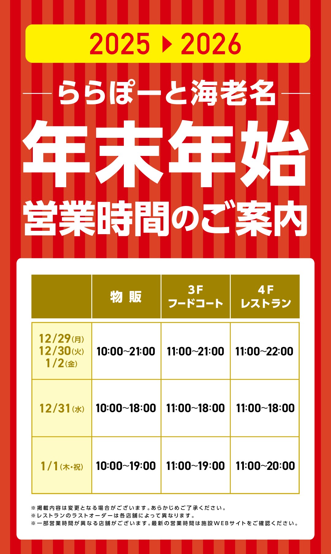 ららぽーと海老名の営業時間変更に伴い、当店の営業時間も変更となります。