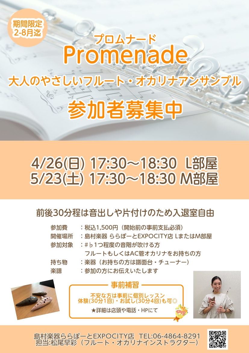 2026年2-8月限定☆ 島村楽器ららぽーとエキスポシティ店で月1定期開催の笛吹きアンサンブルサークルが発足しました! 当日飛び込み参加もOK◎ 関西・大阪・北摂・吹田の方、フルート・オカリナでアンサンブルしましょう♪