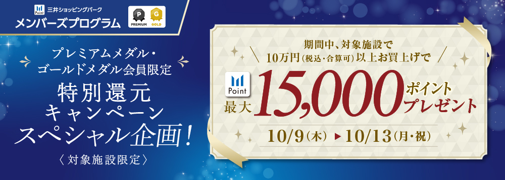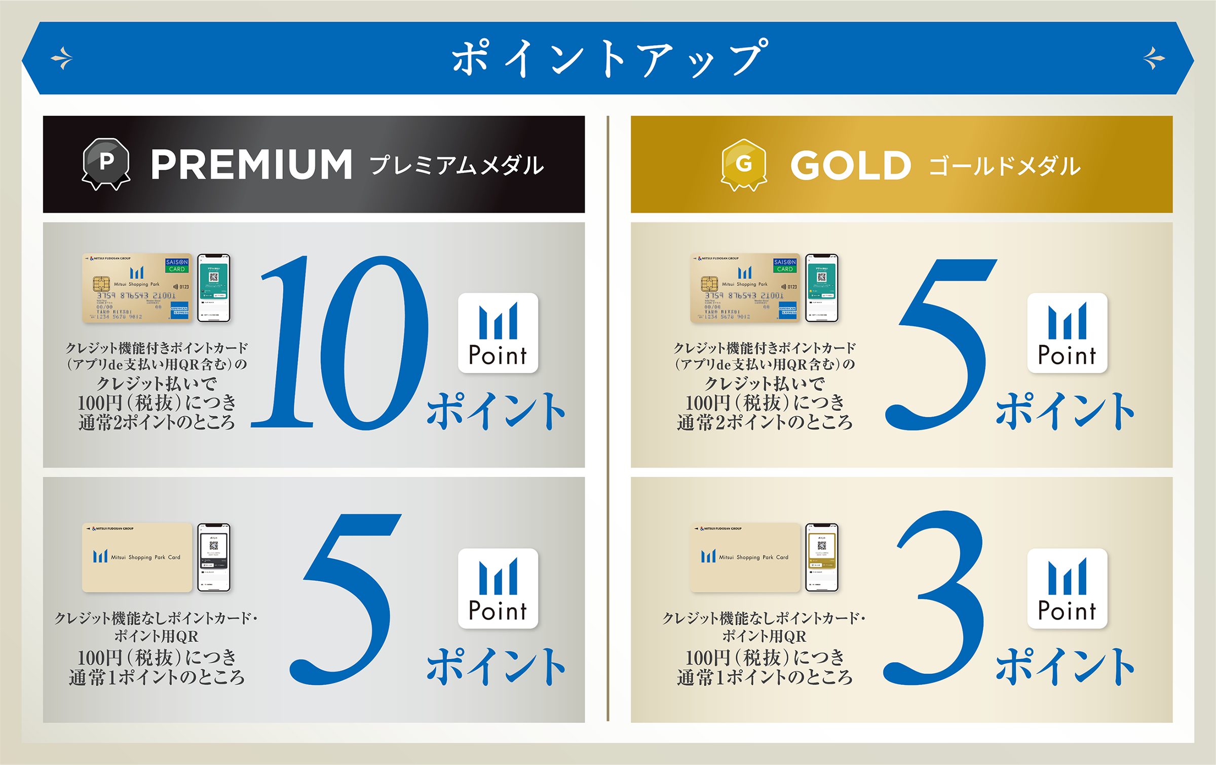 三井ショッピングパークカード会員様のなかでも、プレミアムメダル・ゴールドメダル会員様限定でのポイントアップキャンペーンの開催が決定しました。ぜひこの機会にお得にお買い物してみませんか?