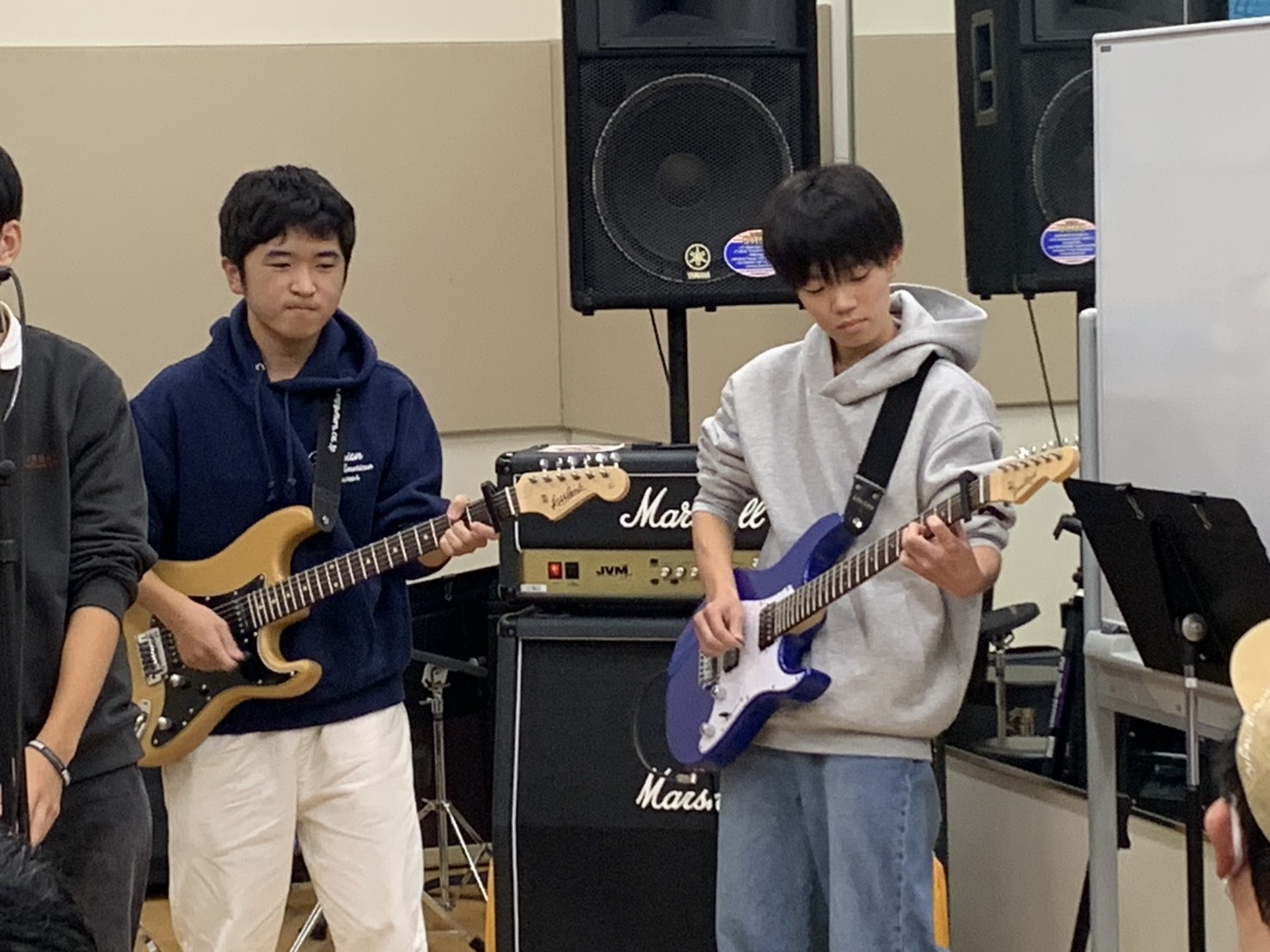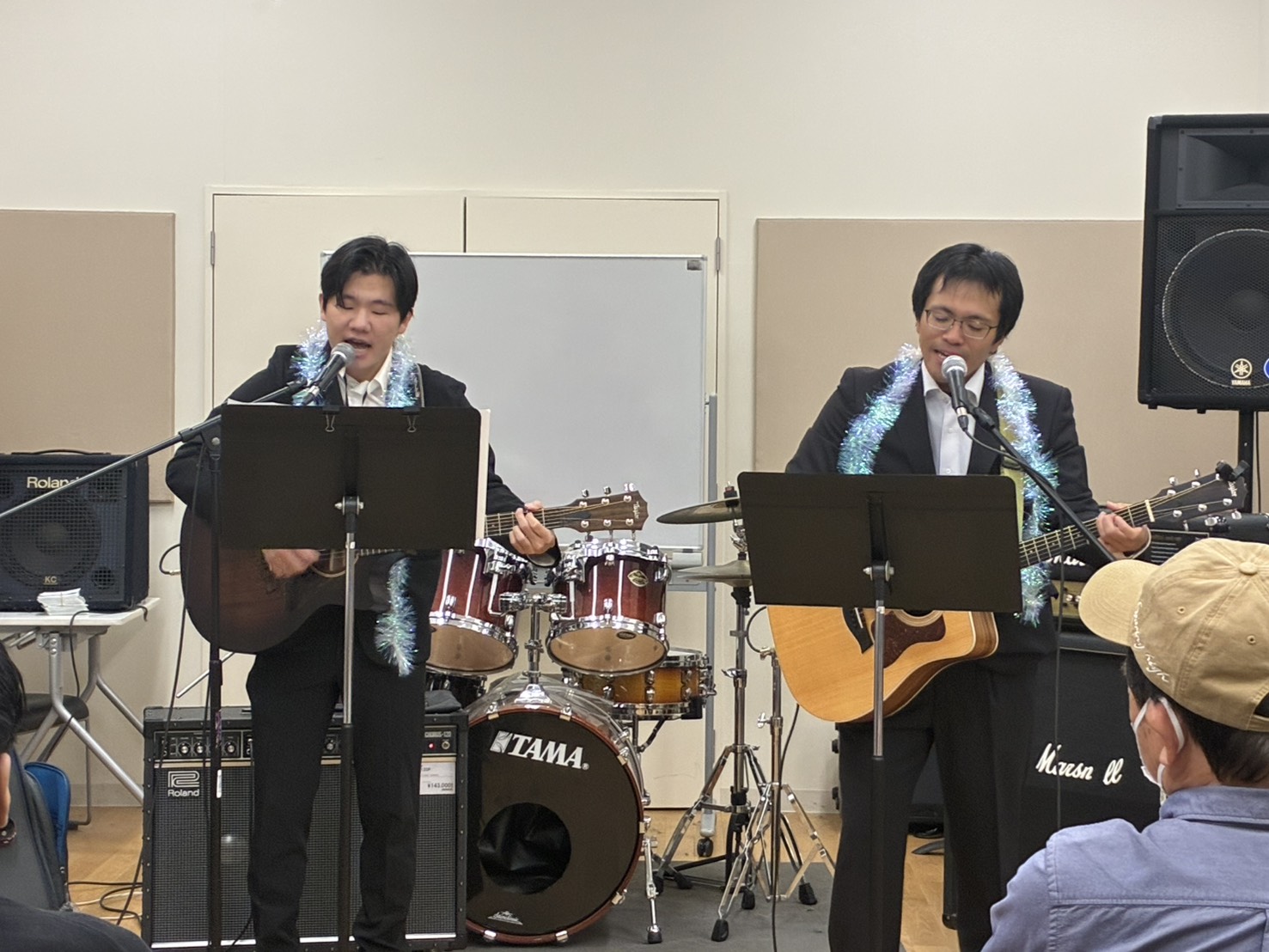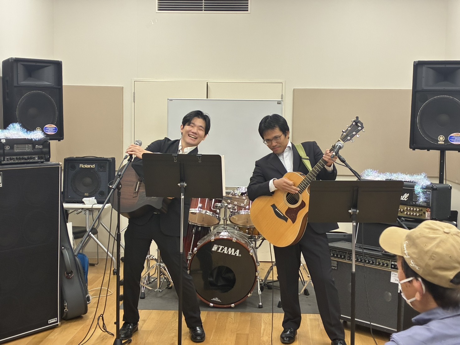 左:スタッフ青井と右:Andy Takaさんの二人が、狩野英孝×2でゆずの「栄光(EIKO)の架橋」を演奏!トップバッターからクセがすごすぎる演奏で盛り上げてくれました。次はどの曲をクセすごでカバーしてくださるのか乞うご期待です◎