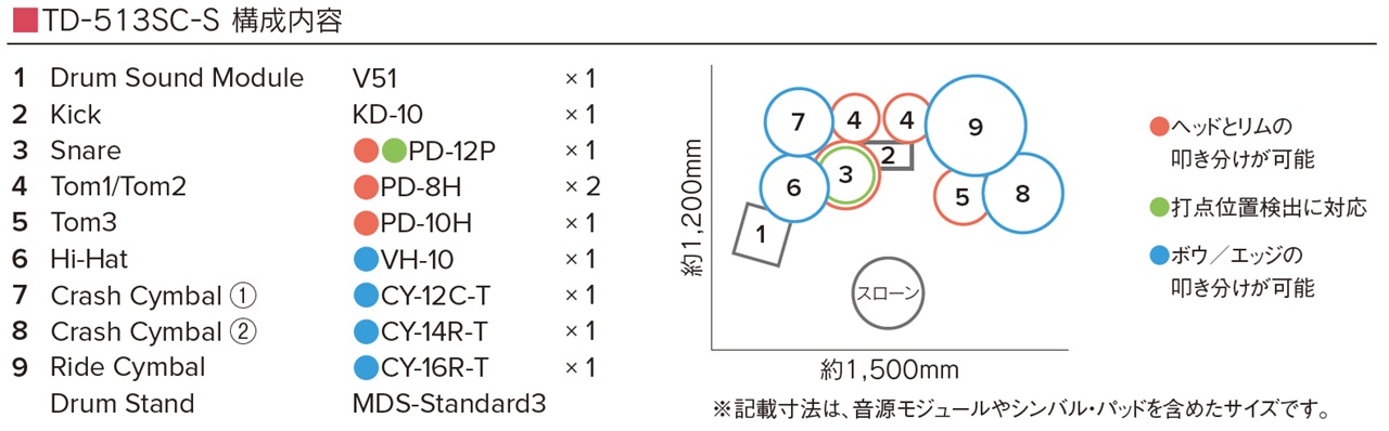 TD313SC-Sは、12インチのスネアや10インチのフロア・タムといった、口径の大きなサイズのパッドを標準搭載しています。