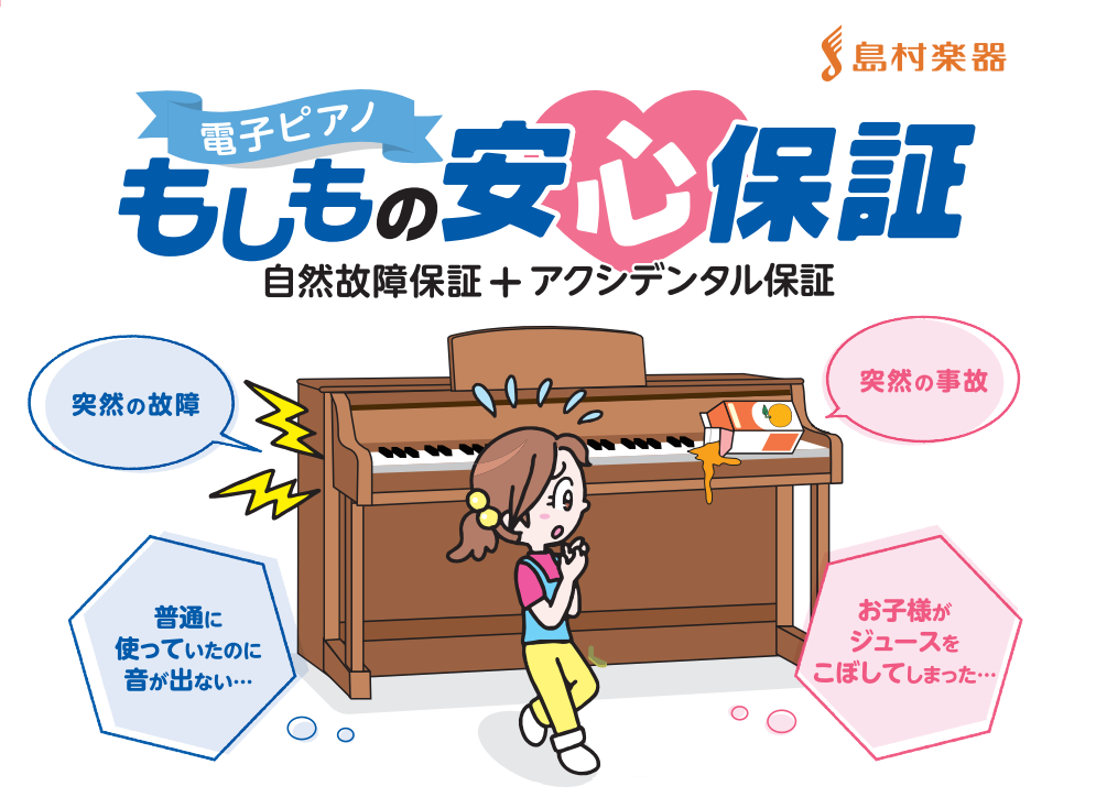 「電子ピアノ もしもの安心保証」は、電源が入らない・音が出ない・操作ボタンが反応しないなどの自然故障保証に加え、偶発的事故を保証するアクシデンタル保証を兼ね備えた、5年間の延長保証サービスです。