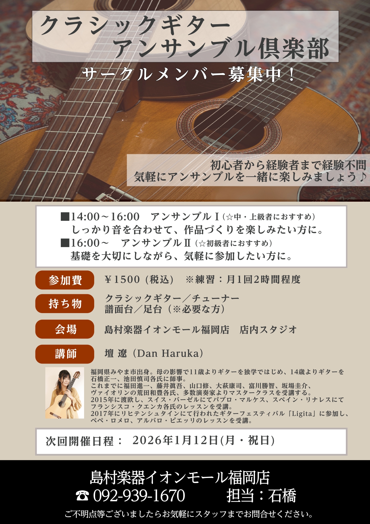 ![CONTENTSクラシックギターアンサンブル倶楽部とは?概要講師紹介クラシックギターアンサンブル倶楽部についてのお問い合わせはコチラクラシックギターアンサンブル倶楽部とは? 「みんなでクラシックギターを弾く」というコンセプトの俱楽部活動です。 みんなで楽しくクラシックギターを楽しむことを目的として、 […]](https://www.shimamura.co.jp/shop/fukuoka-a/wp-content/uploads/sites/122/2025/07/20250704-250531113338501.jpg)