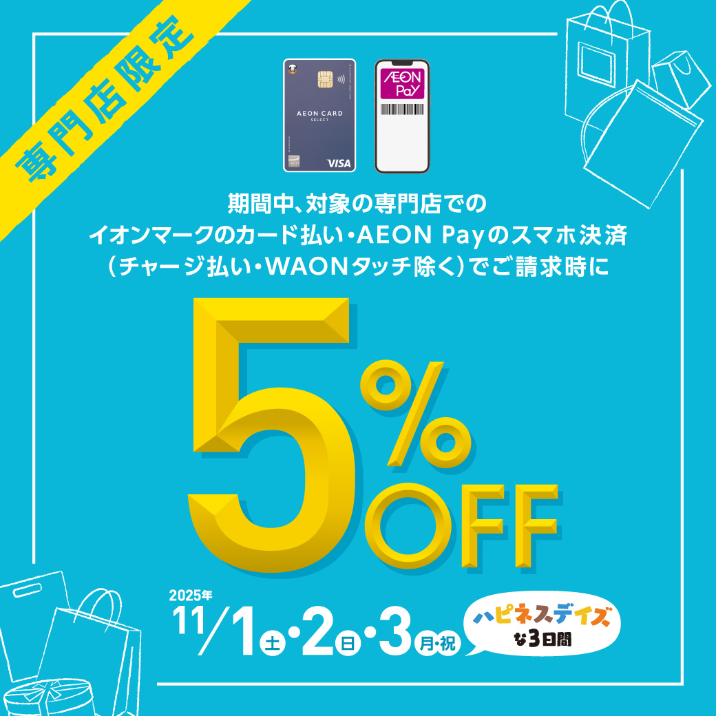 11/1(土)~11/3(月祝)の期間、イオンマークのクレジット払い・AEON Payのスマホ決済のご利用でご請求時に5%OFFになります!この機会にお得に電子ピアノを手に入れませんか?詳細はこちらの画像をクリックするとご確認いただけます。