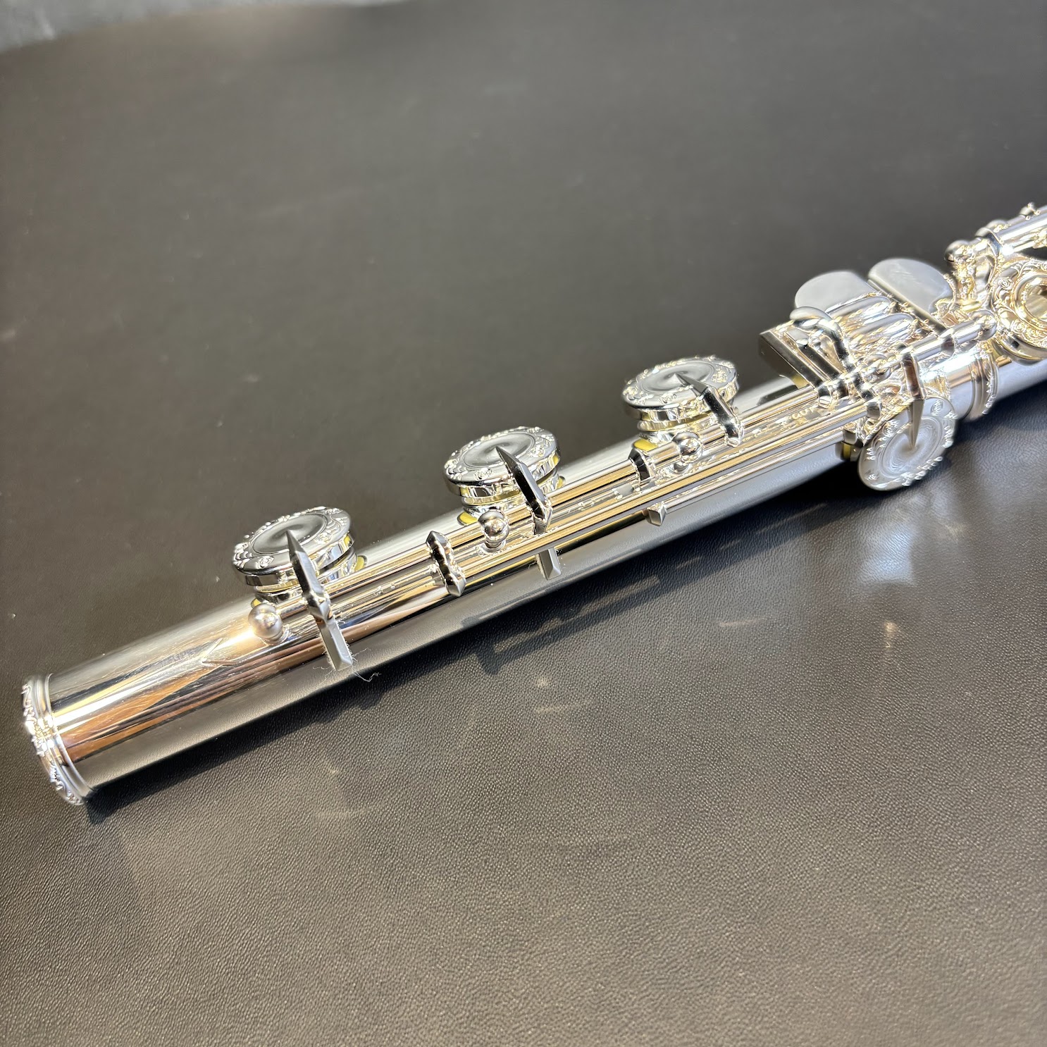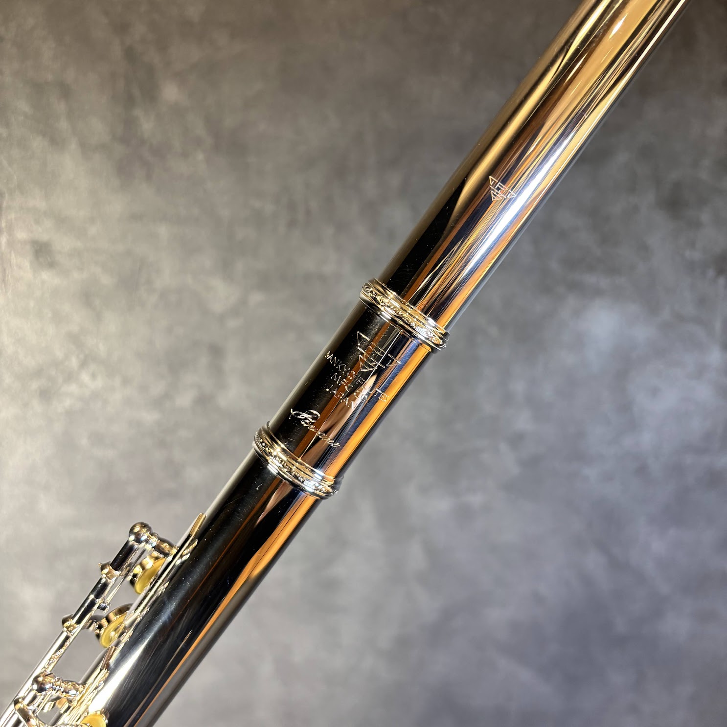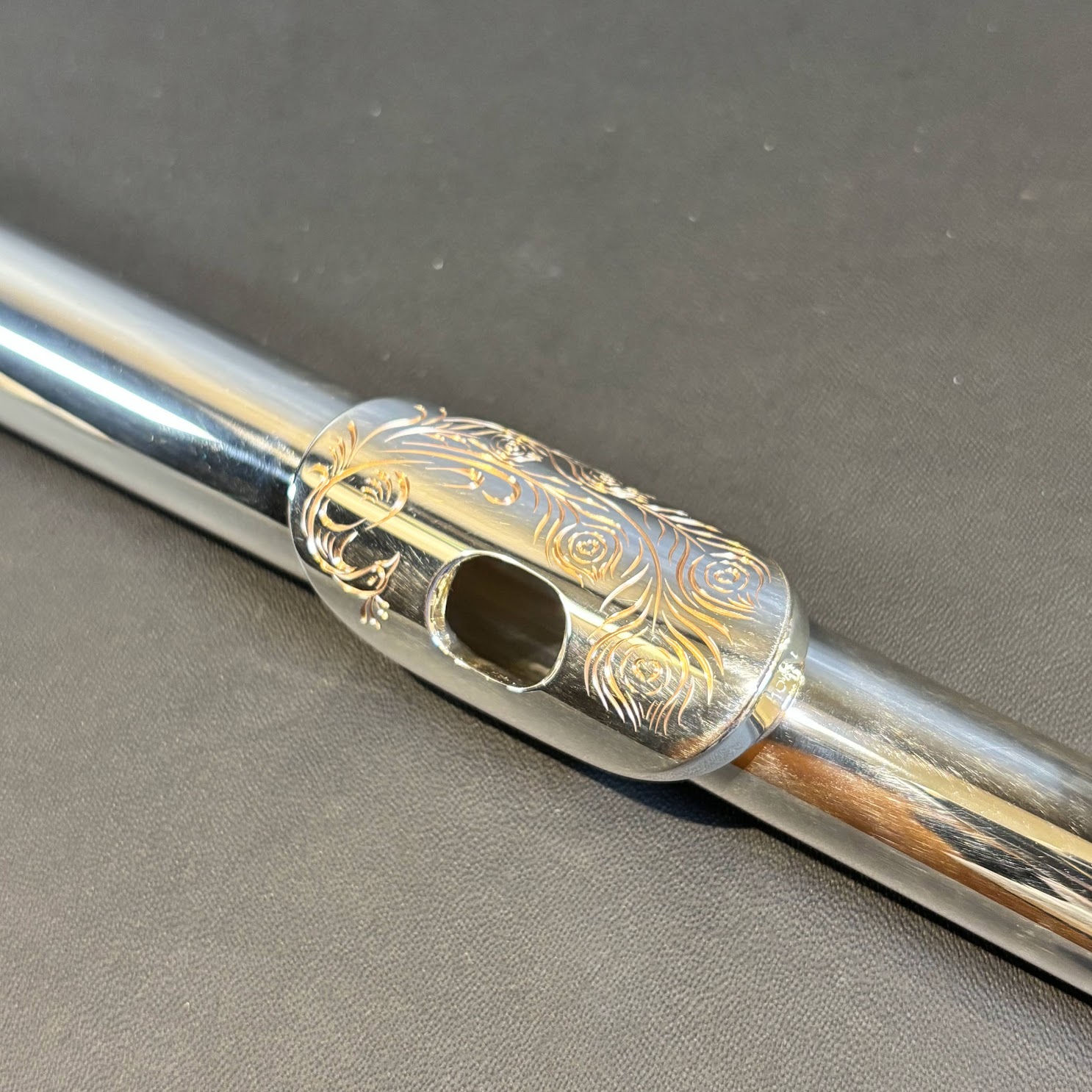 プリマ楽器80周年記念モデル「Pavane」。管体総銀製、リッププレートには10Kゴールドを採用。優雅に舞う孔雀の姿が彫刻され、やわらかく奥行きのある重厚さと、明るく伸びやかな華やかさを兼ね備えた音色を響かせる楽器です。