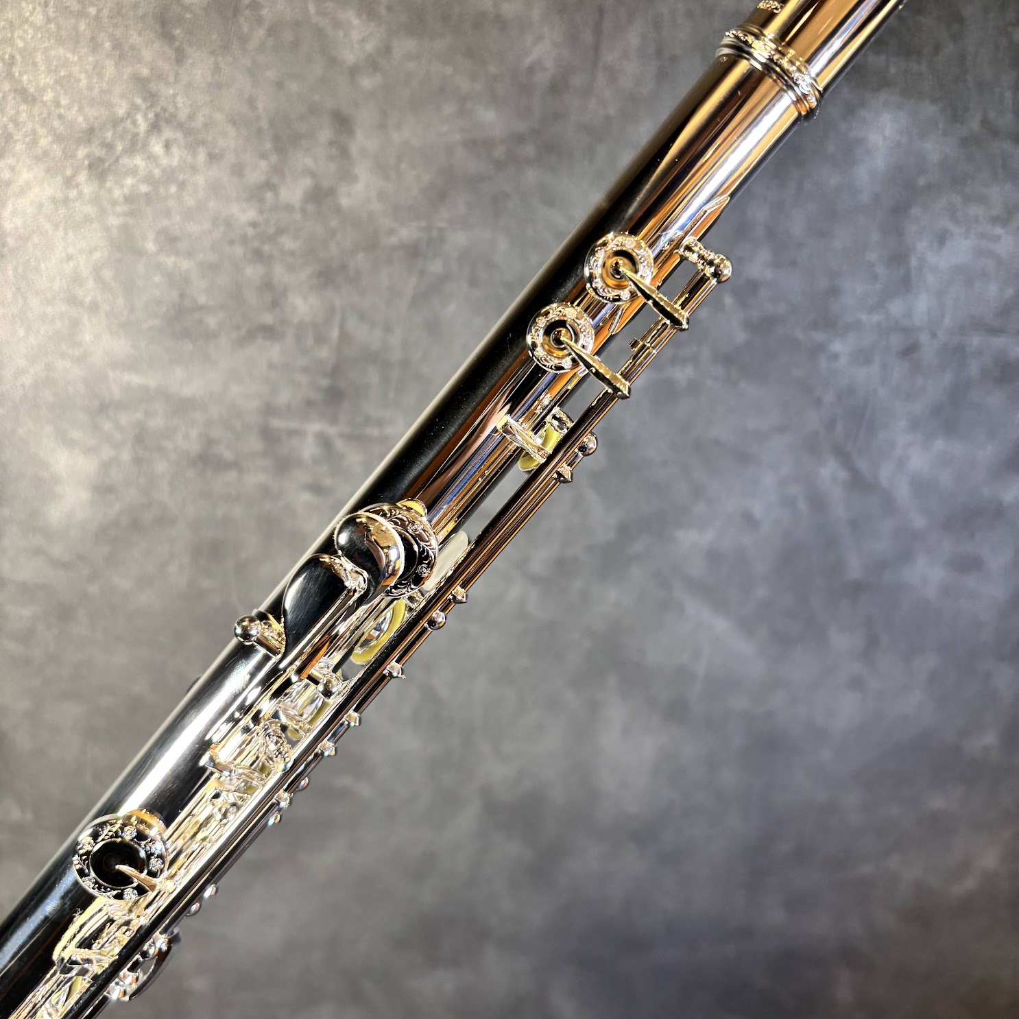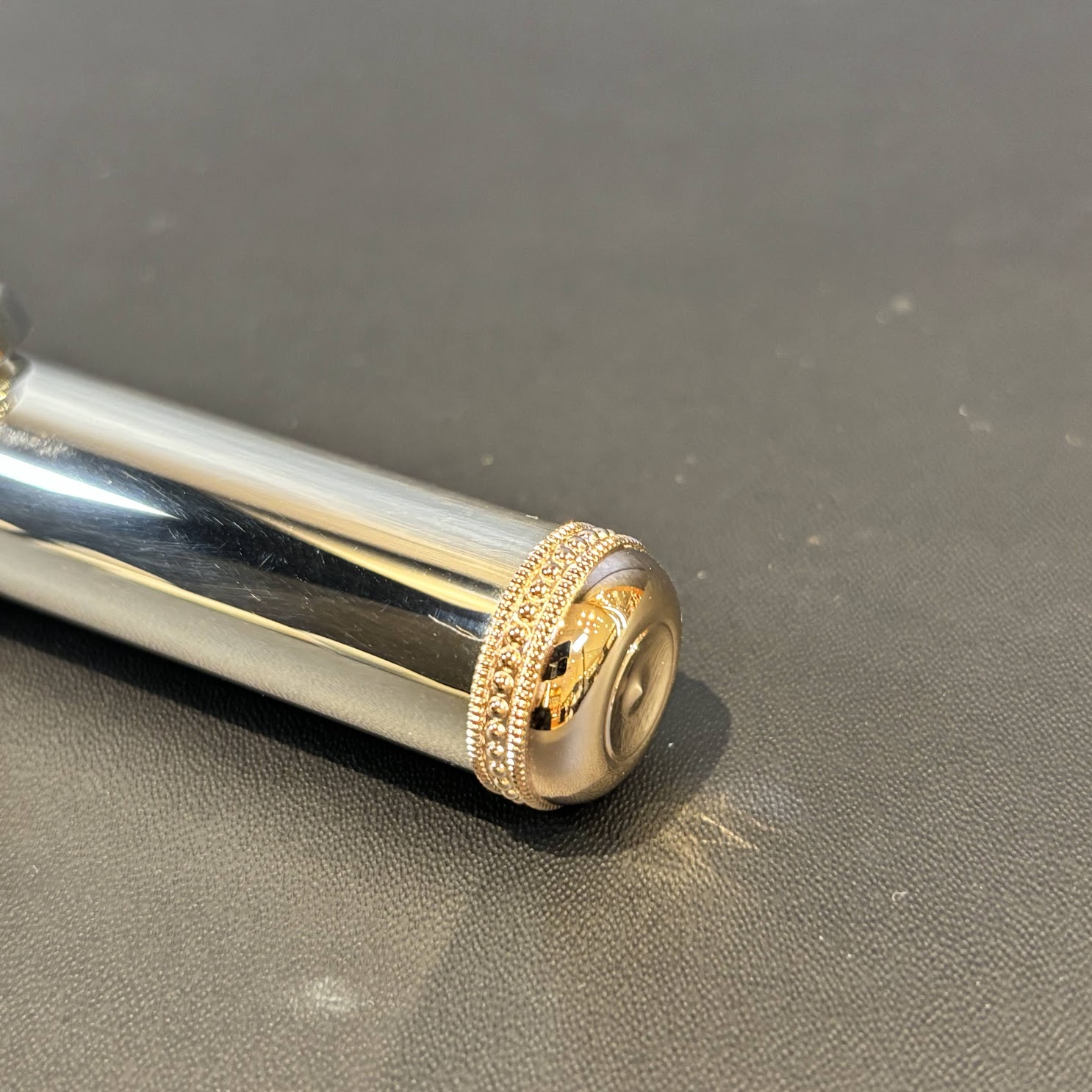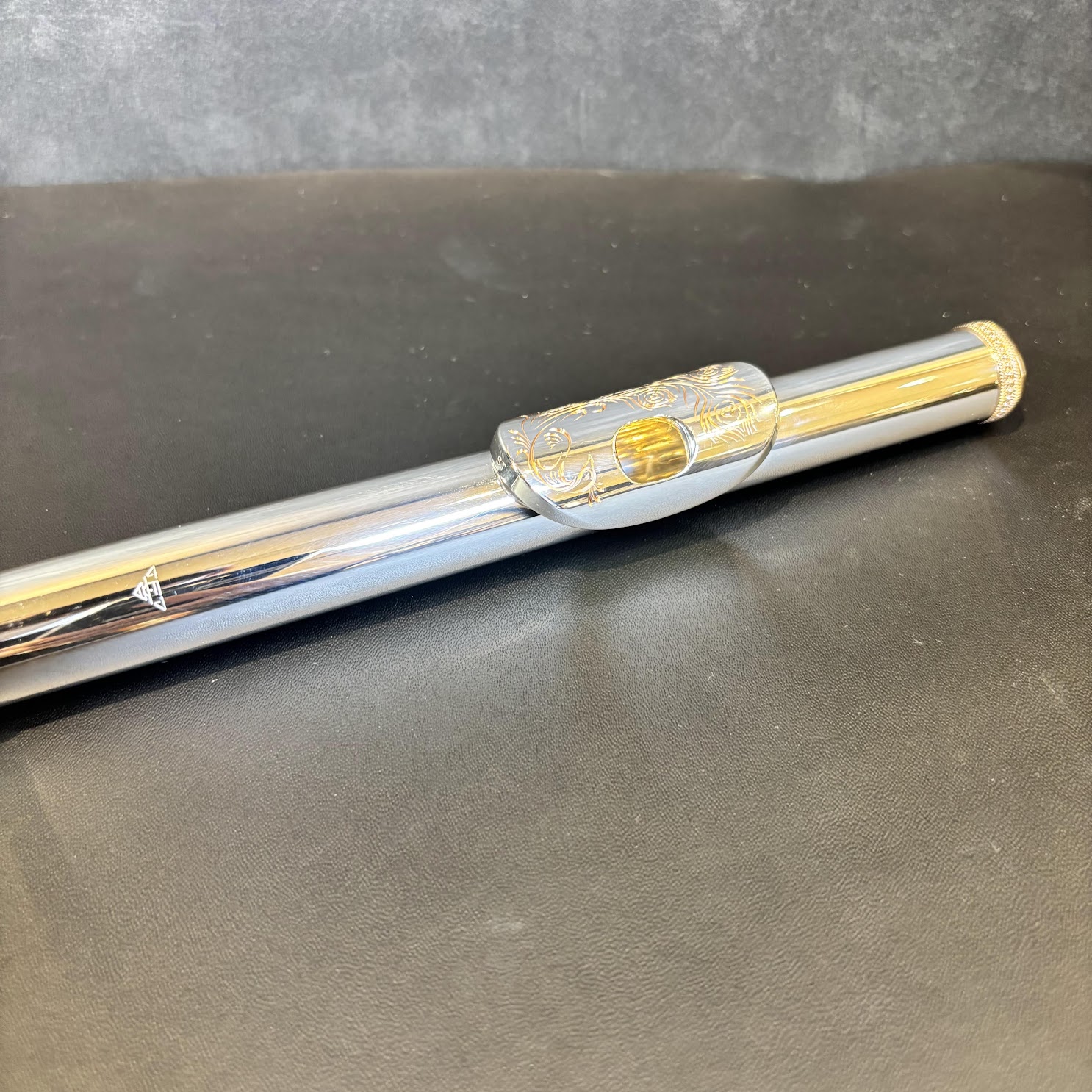 プリマ楽器80周年記念モデル「Pavane」。管体総銀製、リッププレートには10Kゴールドを採用。優雅に舞う孔雀の姿が彫刻され、やわらかく奥行きのある重厚さと、明るく伸びやかな華やかさを兼ね備えた音色を響かせる楽器です。
