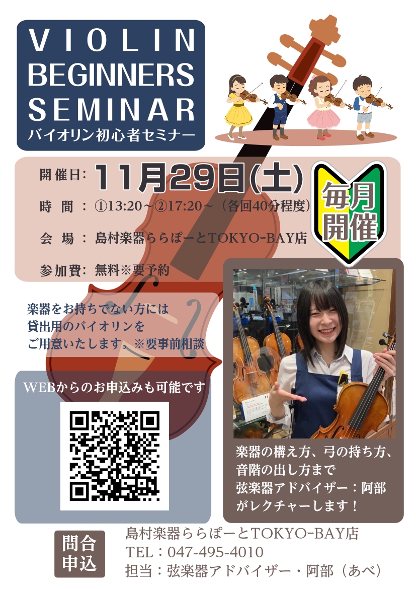 当店スタッフ、弦楽器アドバイザー(社内資格)の阿部がバイオリンの持ち方から音階、簡単な曲等までレクチャー致します!