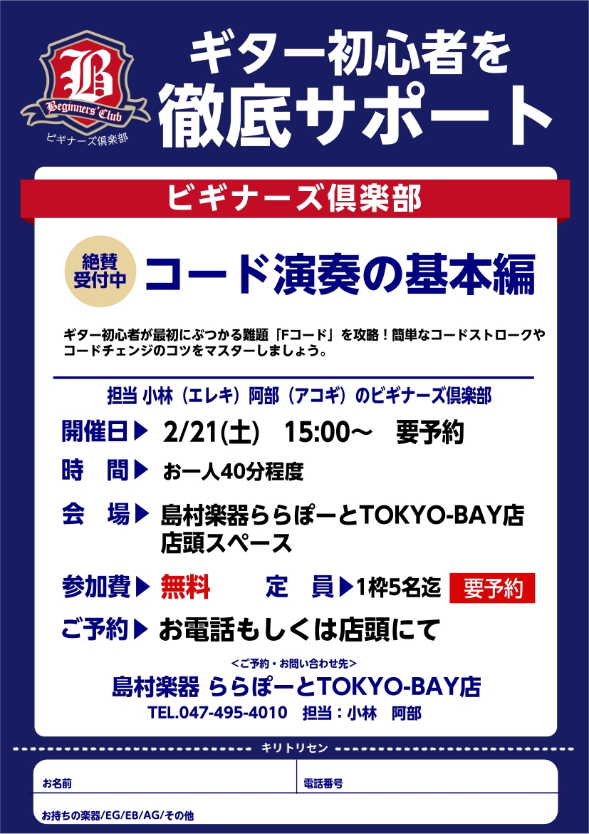 ![CONTENTS島村楽器独自の初心者サポートレッスン【ビギナーズ倶楽部】ビギナーズ倶楽部サポート内容ビギナーズ倶楽部開催日時・ご予約について島村楽器の音楽教室島村楽器独自の初心者サポートレッスン【ビギナーズ倶楽部】 これからギターを始めたいけど何にもわからない、ギターをもっと楽しみたい、基本的な知識 […]](https://www.shimamura.co.jp/shop/funabashi/wp-content/uploads/sites/32/2026/01/20260101-product_shima221018-0012-1_template_pdf_page-0001.jpg)