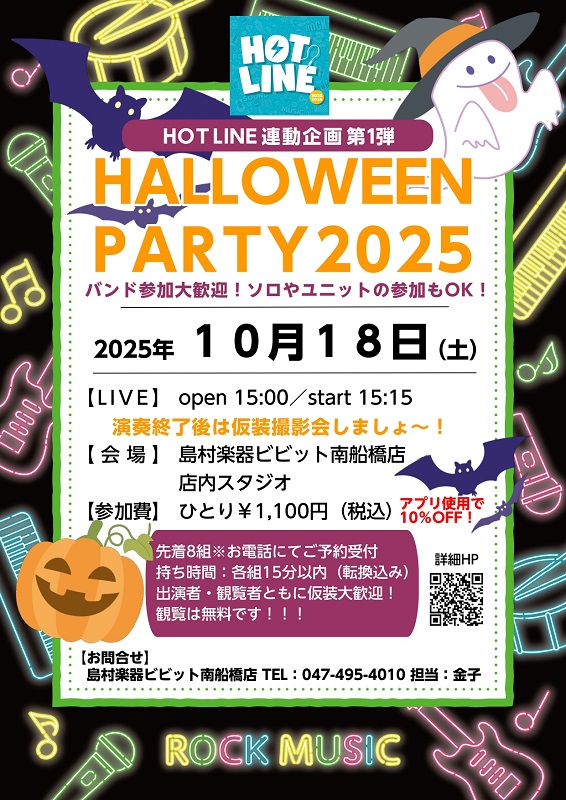 ![みなさん、こんにちは!島村楽器ビビット南船橋店イベント担当の金子です!島村楽器ビビット南船橋店ではHOTLINE連動企画として、10月18日(土)にライブイベント HALLOWEEN PARTY(ハロウィン パーティー)2025 ・・・を開催いたします!!!学生の皆さんでしたら、軽音楽部の文化祭前の […]](https://www.shimamura.co.jp/shop/funabashi/wp-content/uploads/sites/32/2025/09/20250919-hw_1018_page-0001.jpg)