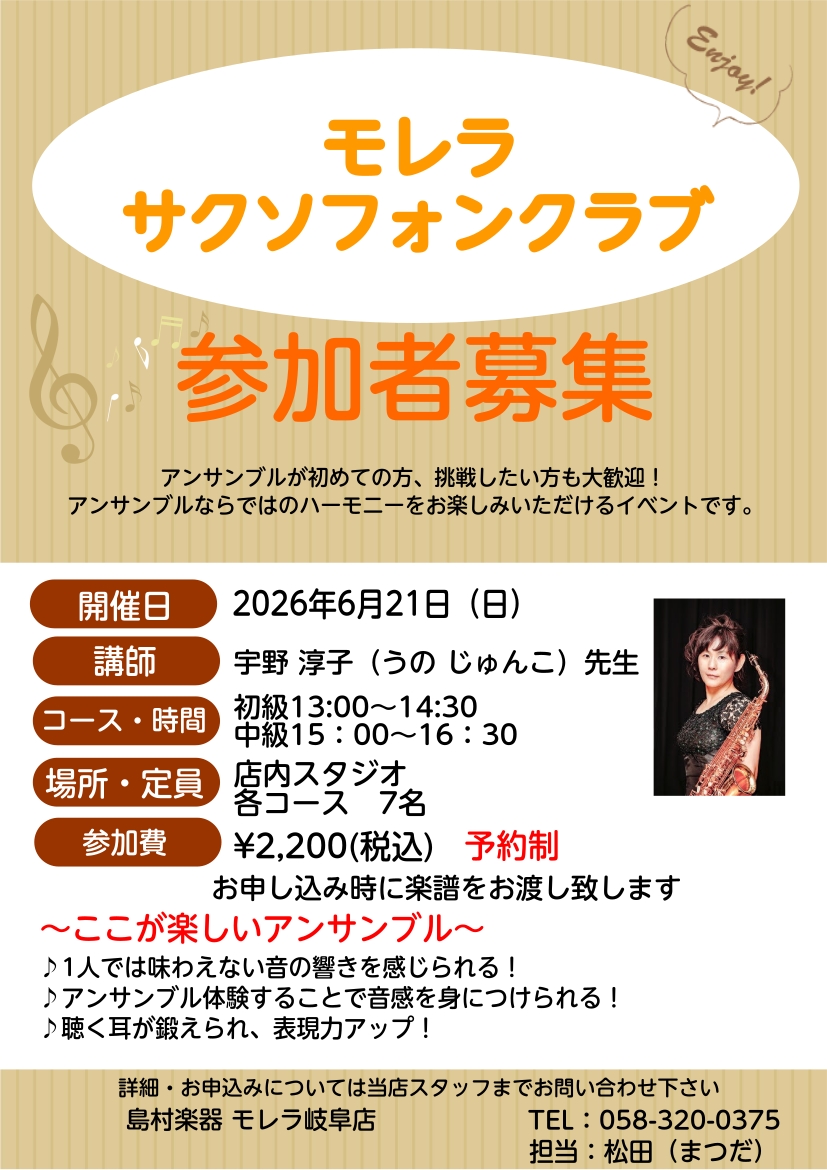 ![皆様こんにちは!島村楽器モレラ岐阜店 管楽器担当松田(まつだ)です!今回は岐阜店で開催のモレラサクソフォン倶楽部のご紹介♪ CONTENTSモレラサクソフォン倶楽部とはお申し込み方法モレラサクソフォン倶楽部とは ・サックスを始めたけど、人とあわせた事がない・・・・一緒にサックスを吹くサックス仲間が欲 […]](https://www.shimamura.co.jp/shop/gifu/wp-content/uploads/sites/81/2023/06/20230623-20170824-tmp-saxophone.jpg)