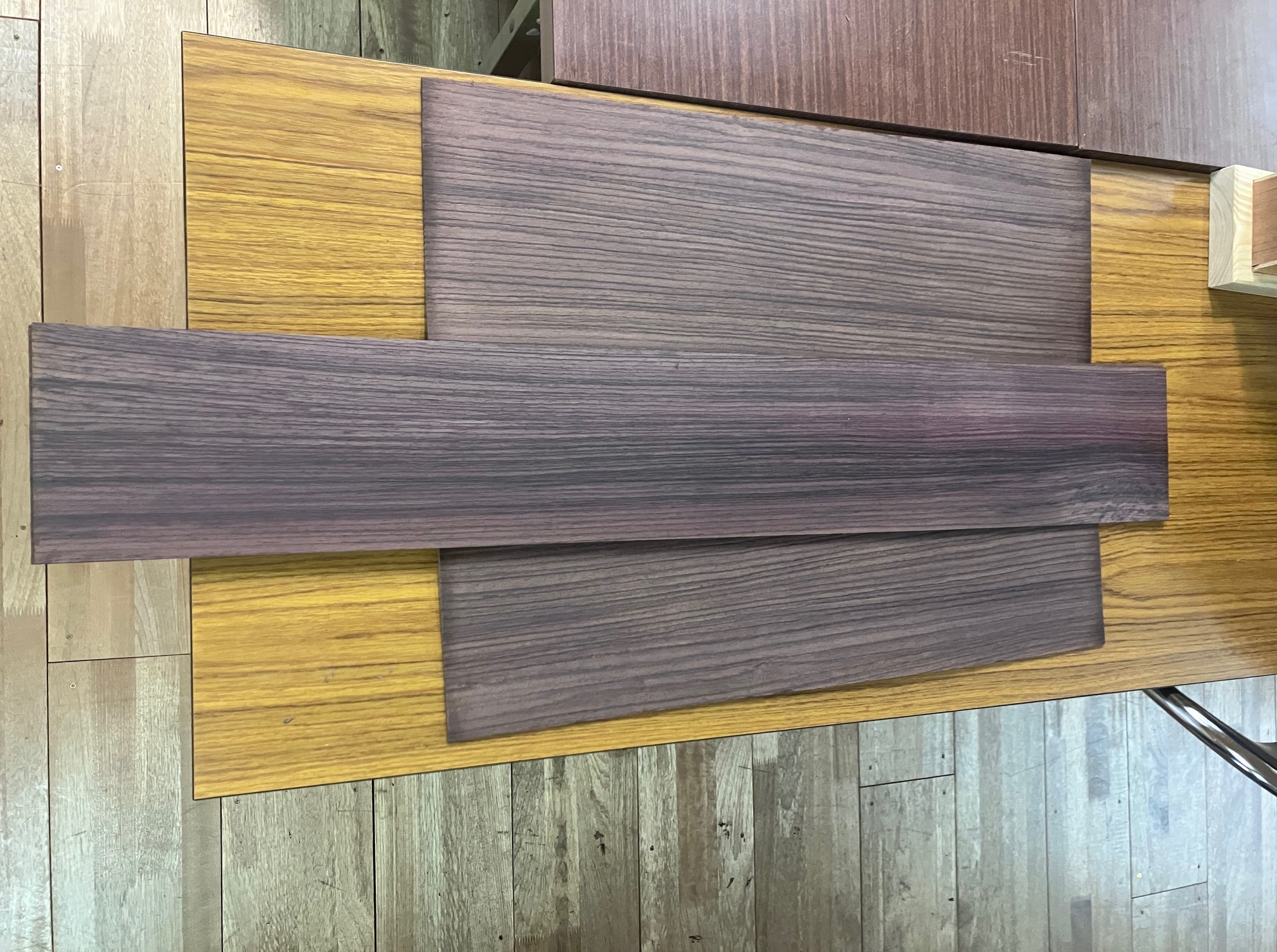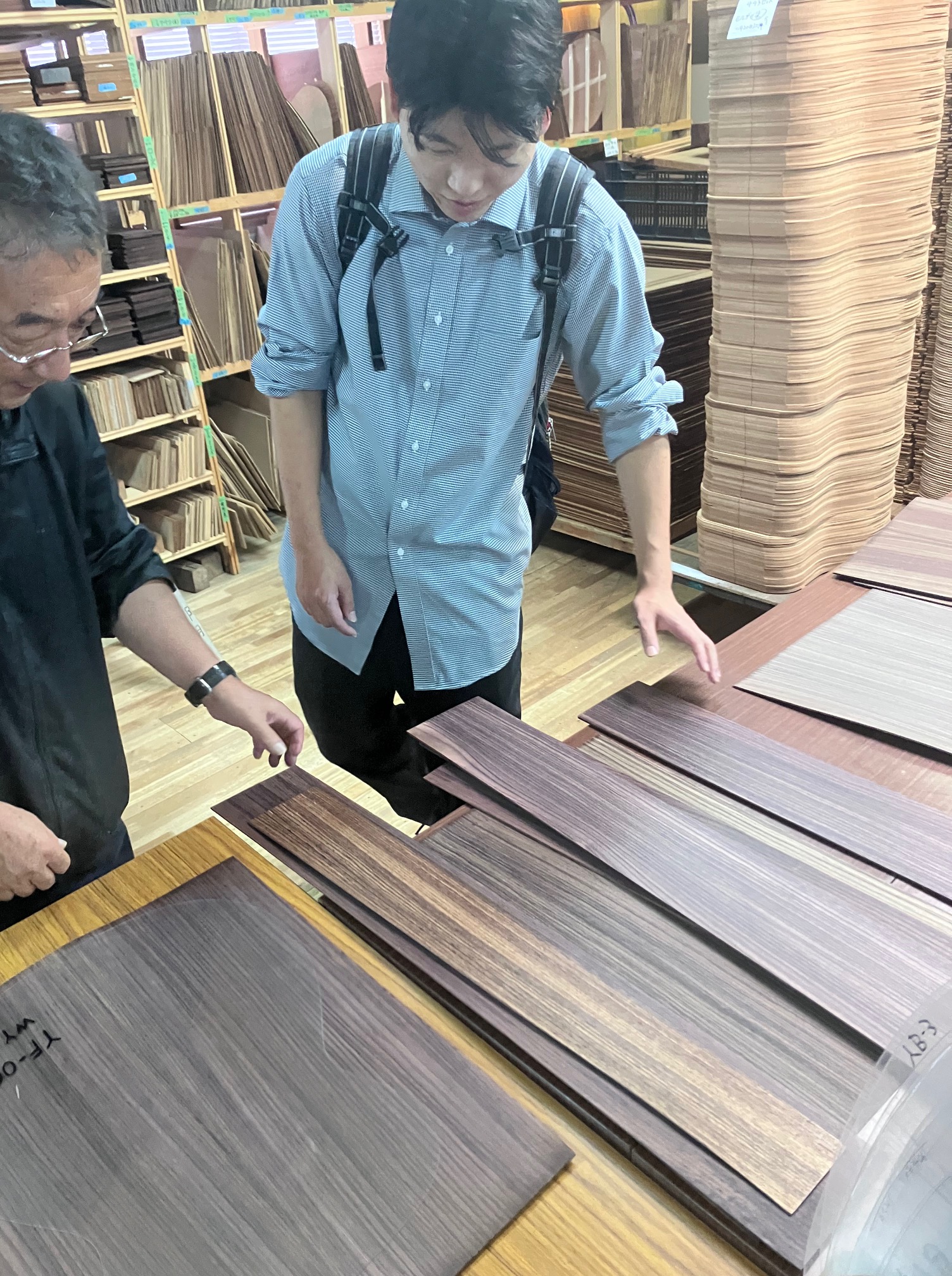 ヤイリ職人さんのアドバイスをいただきながら、トップ材とサイド&バック材の選定をしました。