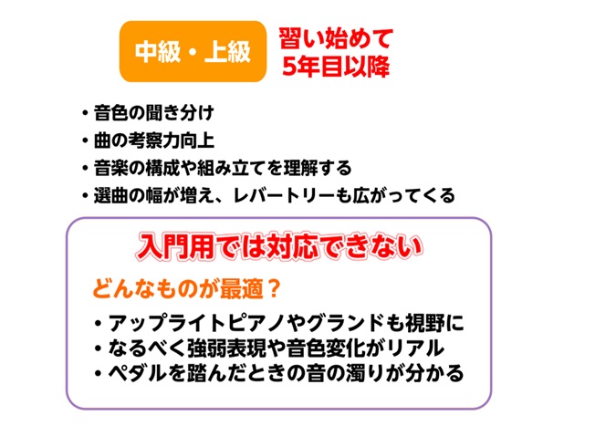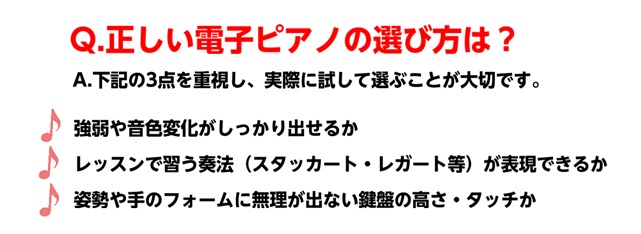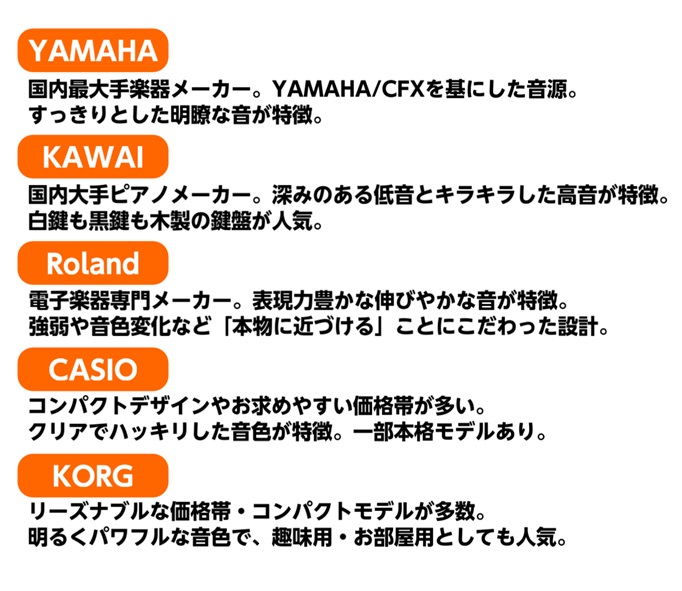 一方で、メーカーや価格帯・グレードによって機能やタッチがかなり違うため、「見た目と価格だけ」で選んでしまうと、レッスン内容に合わず、上達の妨げになるケースもあります。
