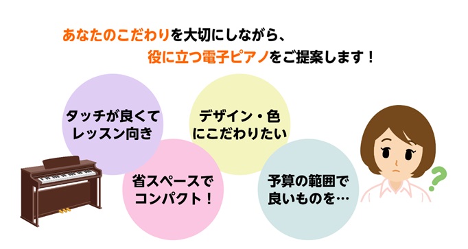 広島市内・安佐北区・安佐南区エリアで電子ピアノをお探しの方、実際に「弾き比べ」ながらお選びいただけます。